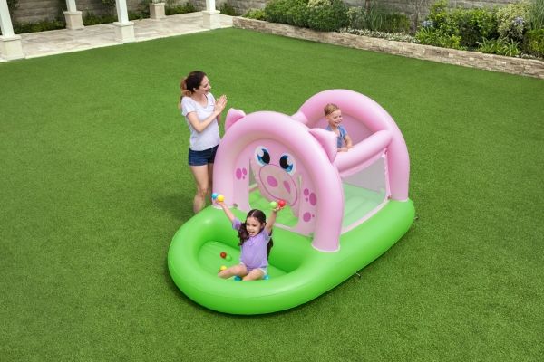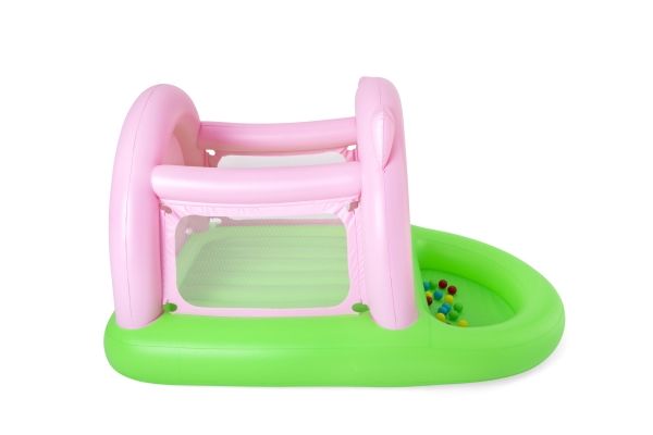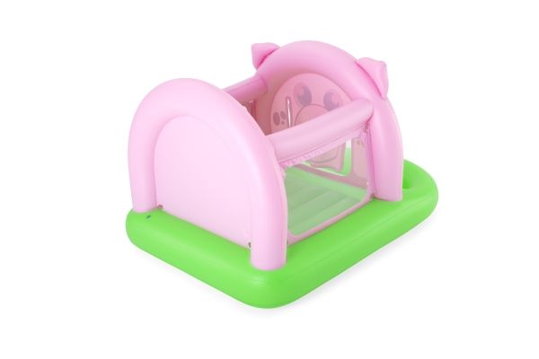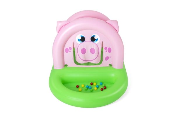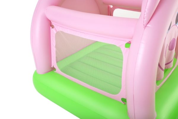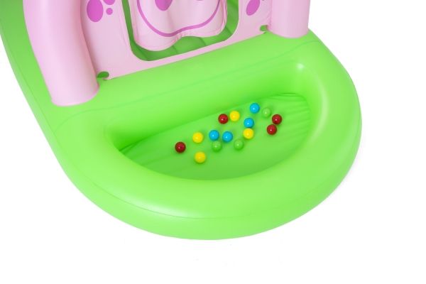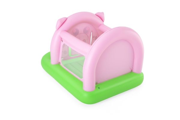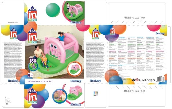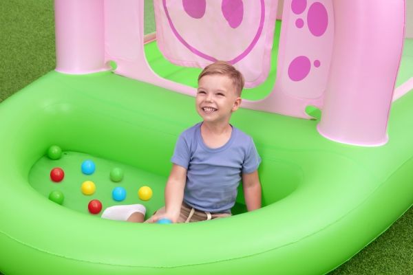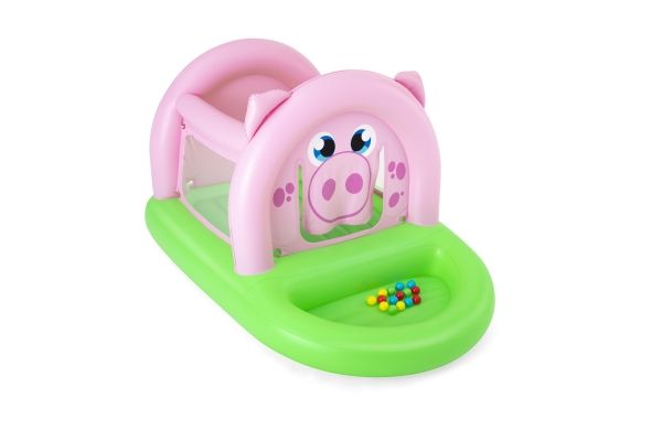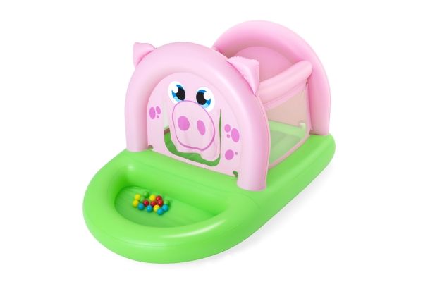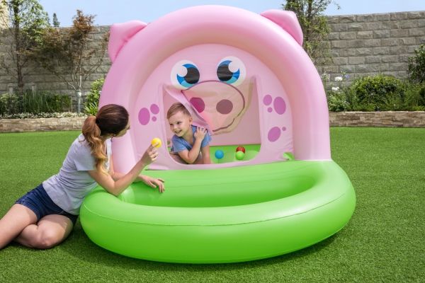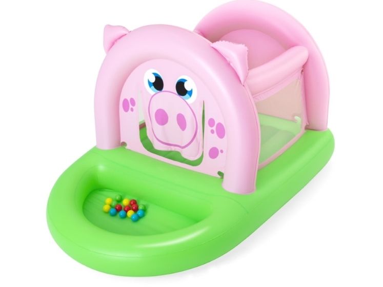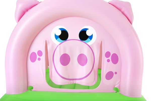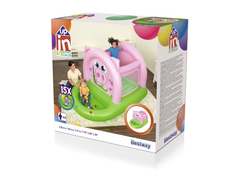 For double the fun and year round play, bring home the Up In & Over™ Oinkster Pig Bouncer and Ball Pit! This combo item features two fun activity areas that will keep kids entertained for hours. Plus, it includes 15 play balls for them to play with in the ball pit area, which help to develop hand-eye coordination and motor skills! Simply climb through the pig’s mouth for hours of interactive fun. The Oinkster Pig Bouncer and Ball Pit is the new family friend that’s sure to get imaginations flowing. It features mesh sidewalls, so you’ll be able to easily keep an eye on the kids as they bounce the day away. This cute pig bouncer is super simple to inflate, deflate and store. It’s just one air chamber, inflating quickly with no pieces that need to be put together. Play time just got a whole lot better with the Up In & Over Oinkster Pig Bouncer and Ball Pit!