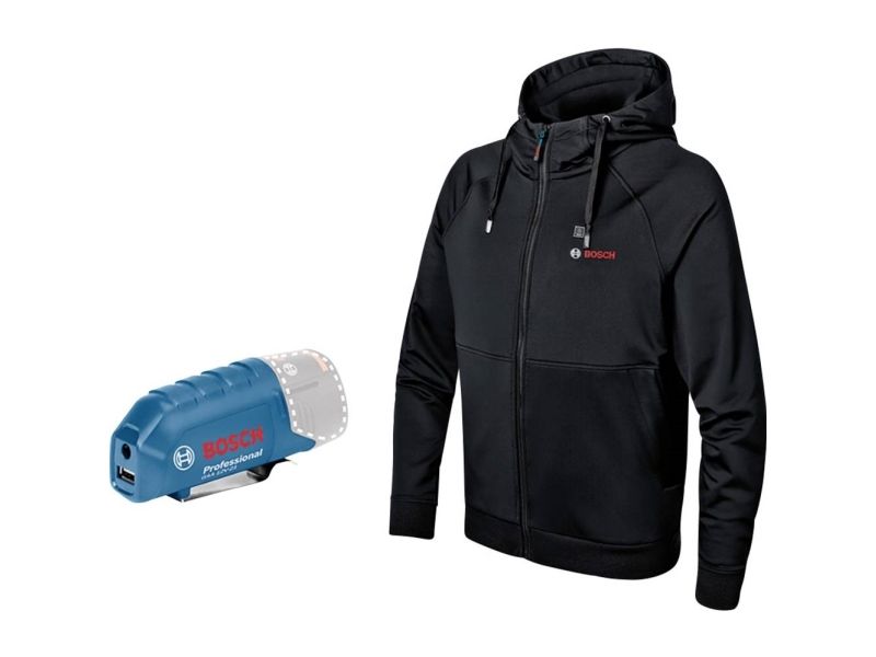 Bosch Betiterbar jakke GHH 12+18V XA Perfekt midlayer-artikel, som holder sig varm på trods af kolde temperaturer og dårligt vejr · tre zoners-opvarmning og tre varmetrin til perfekt fordelt, permanent Varme · enkel opladning af USB-enheder via den integrerede port på batteriadapteren. Fremragende midlayer-Varme til kolde dage - Boch opvarmet Hoodie