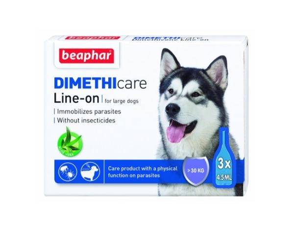 Beaphar Dimethicare Line-On för stora hundar >30kg, kan användas för att stödja underhållet av huden och pälsen. Förutom den mjukgörande funktionen i produkten, så kan den även användas för att behandla djur mot parasiter.