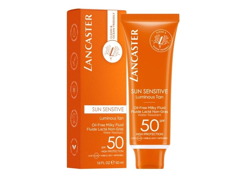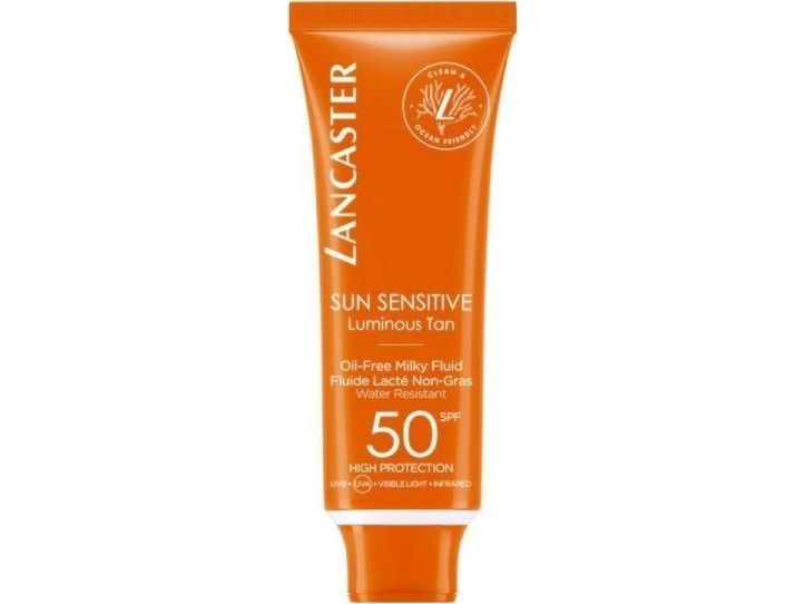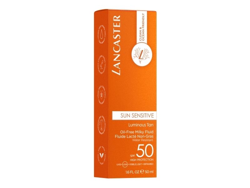 Sun Sensitive is Lancaster's best-performance sun protection in high-tolerance formulas for sensitive skin. Our patented Full Light Technology protects from UVA/UVB/Visible light/Infrared rays while our natural-origin Sunsicalm complex soothes and preserves sensitike skin from sun-induced damages. Clean and ocean friendly, this lightweight and oil-free milky texture, invisible once applied, provides a highly sensorial finish. Your skin is beautified. Use this high tolerance, non-sticky Oil-Free Milky Fluid SPF50 for a comfortable sensation on your skin.
