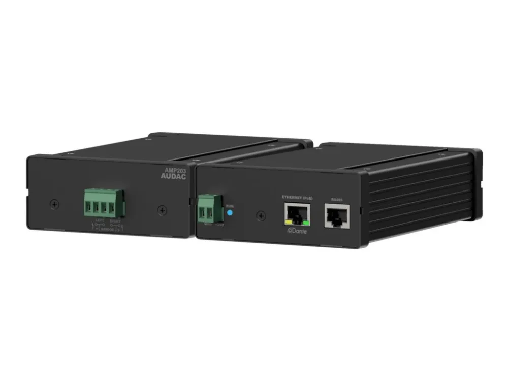 2 x utgang høyttalere (tilkoblingsklemme) - foran Dante (RJ-45) - bak RS-485 (RJ-45) - bak DC-strøminngang (tilkoblingsklemme) - bak
