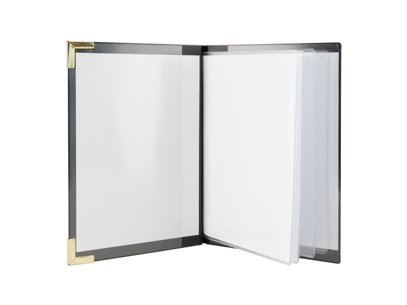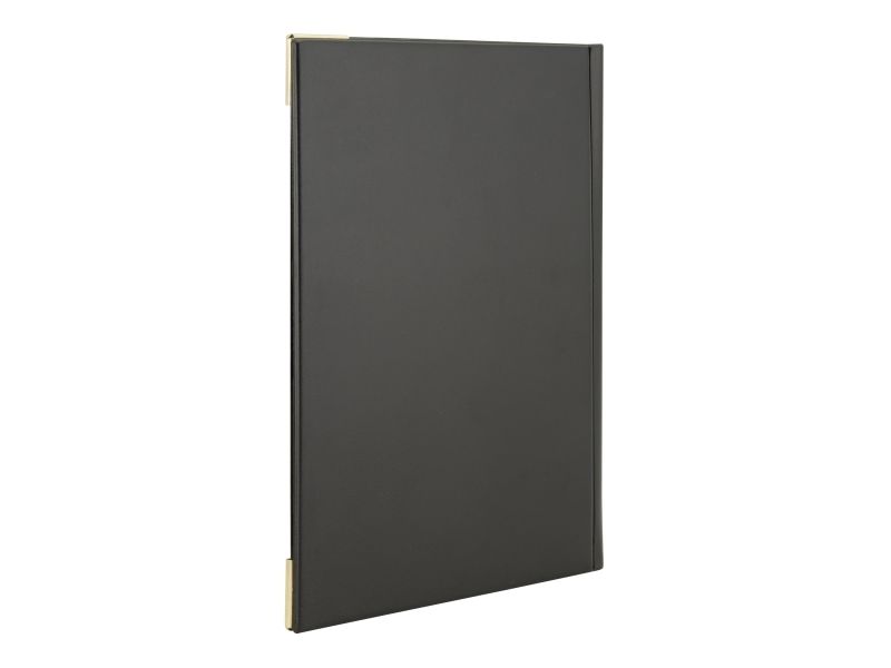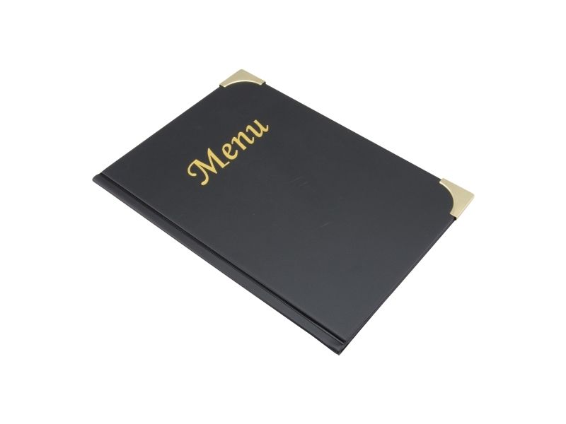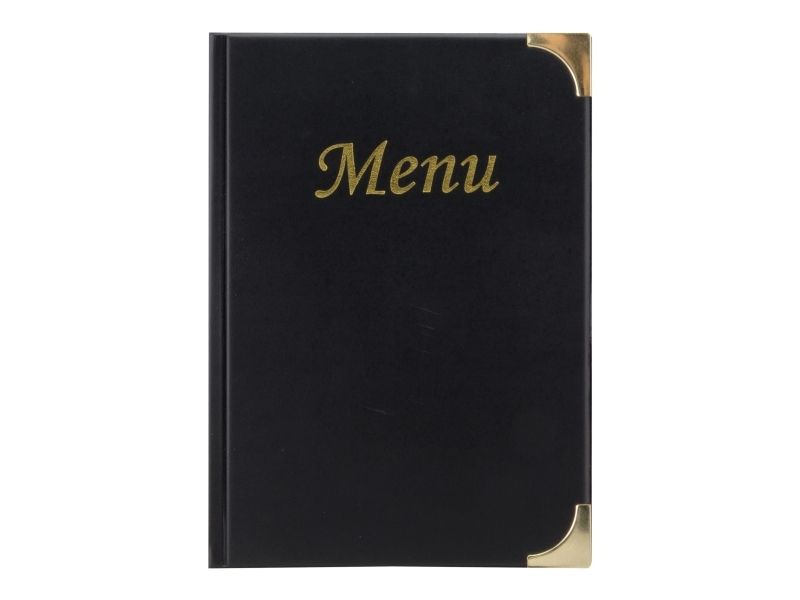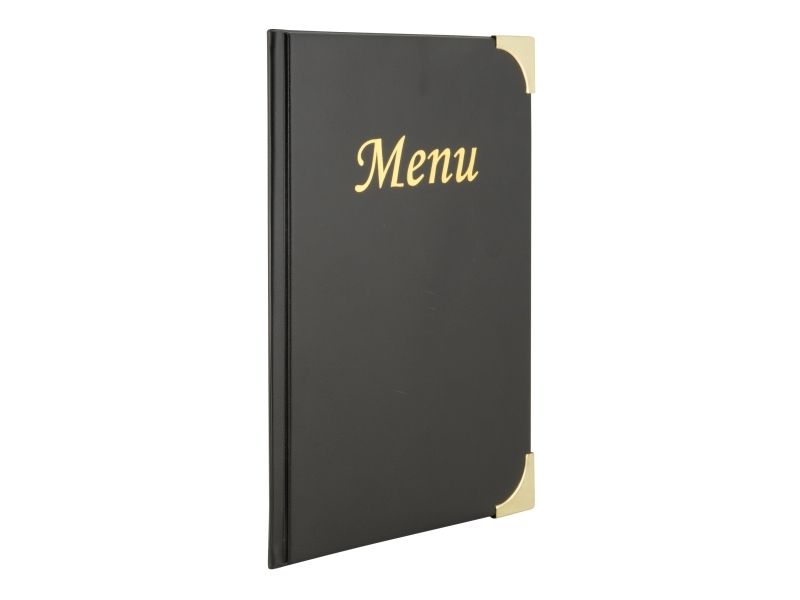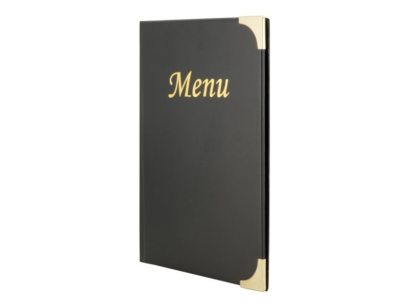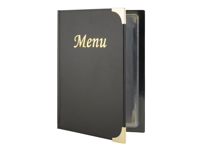 • Back to Basic med Securit® A5 Basic Menuomslag. Dette menuomslag i læderstil med "Menu" i guld-print, har guldfarvede hjørnebeskyttere af metal og en overflade, der er let at rengøre. Indeholder 4 faste lommer 8 x A5-sider og 2 omslagslommer. Brug det sammen med den matchende Securit® Basic Wine Card og Securit® regningholder. Fås i forskellige farver og variationer.