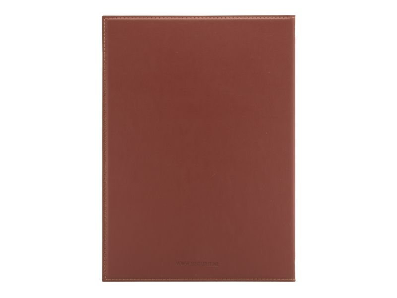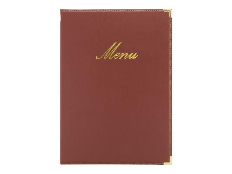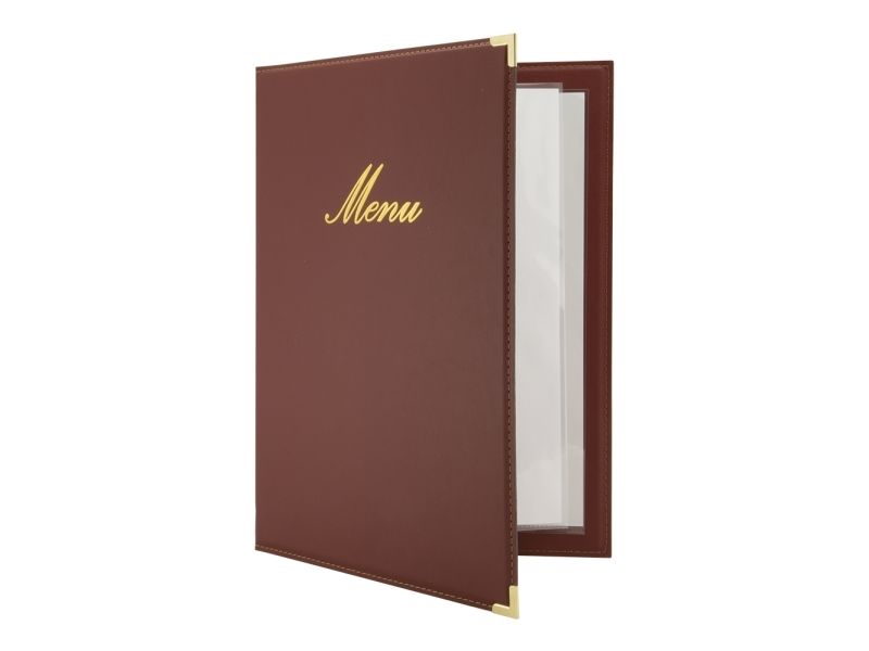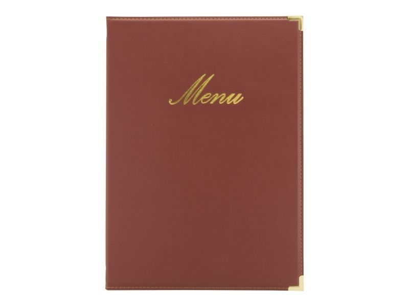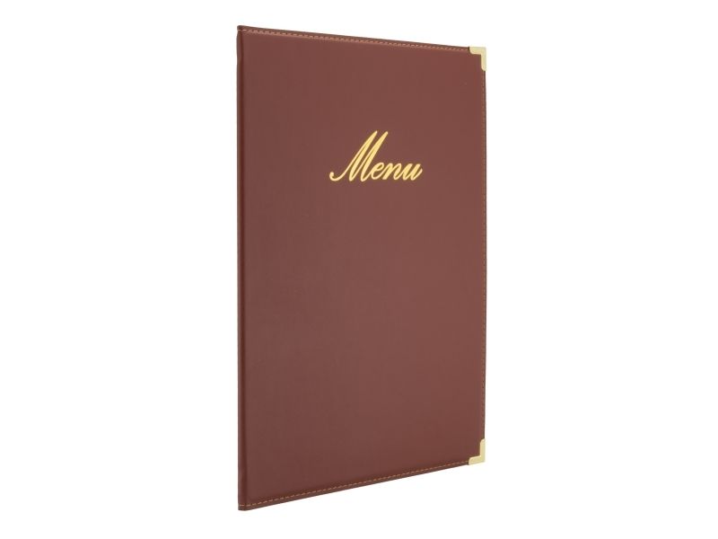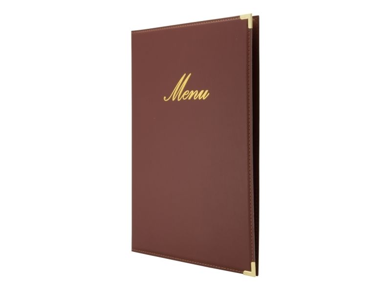 • Klassisk Securit® A4 menuomslag. Dette håndsyede, klassiske menuomslag i læderstil med »Menu" printed i guldfarve er perfekt til traditionelle barer og restauranter. Med guldfarvede metal hjørnebeskyttere er det designet til intensivt brug. En dobbeltsidet lomme til 4 x A4-sider inkluderet. Kan let isættes flere lommer. Fås i forskellige farver og variationer.