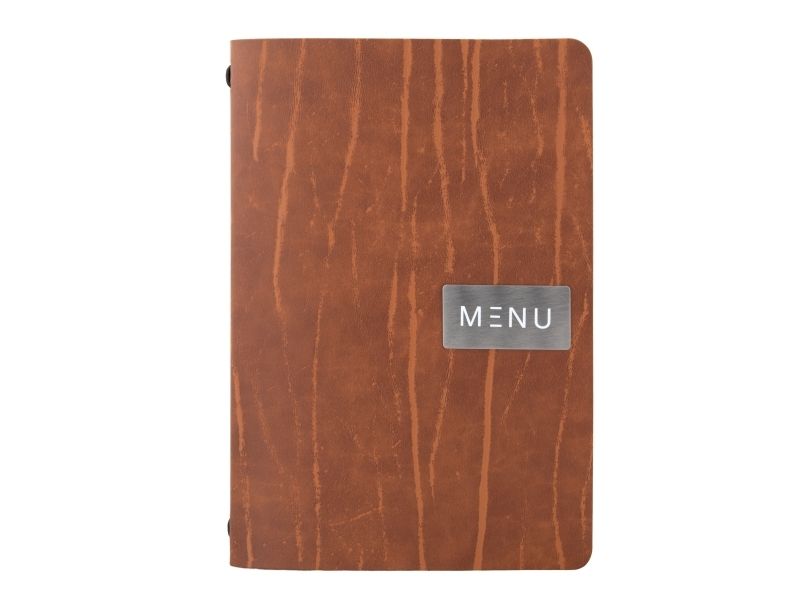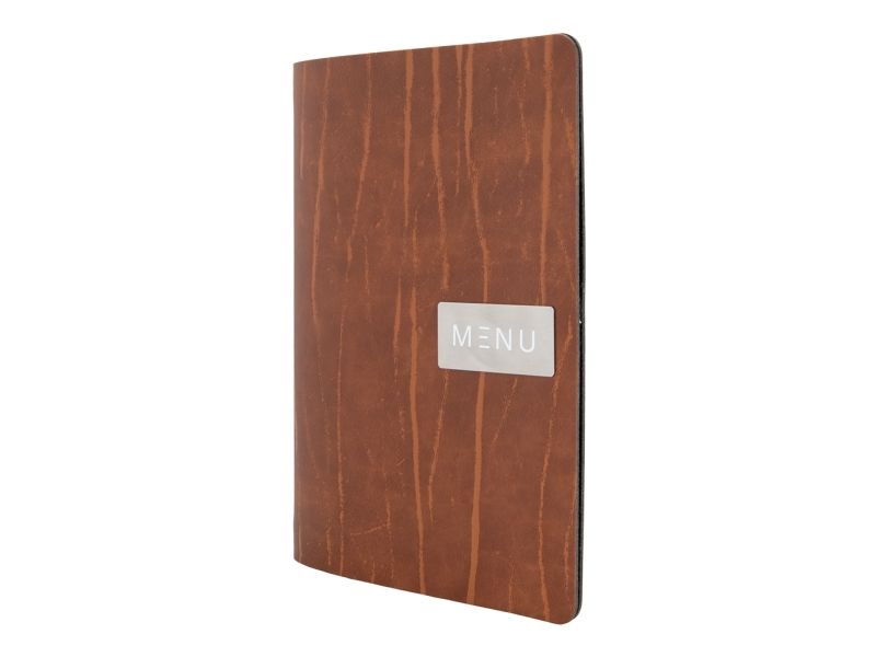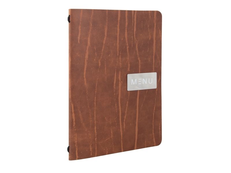Luksuriøst Securit® A5 brunt læder menuomslag til din restaurant, bar eller hotel. Fremstillet af 100% genbrugt naturligt brunt øko-læder med 0% produktionsaffald. Dette menuomslag er fleksibelt, nemt at rengøre og passer perfekt til ethvert bord. En trykt metalplade påtrykt "Menu" og en blank metalplade, som du selv kan få indgraveret og personliggøre, er inkluderet. En dobbeltsidet lomme til 4 x A5-sider er inkluderet. Takket være den praktiske elastiske holder kan dette menuomslag let udvides op til 40 x A5-sider med Securit® Menu lommer. Lommerne er fremstillet af miljøvenligt polypropylen af høj kvalitet. Menuomslagene fås i forskellige farver, strukturer og størrelser.