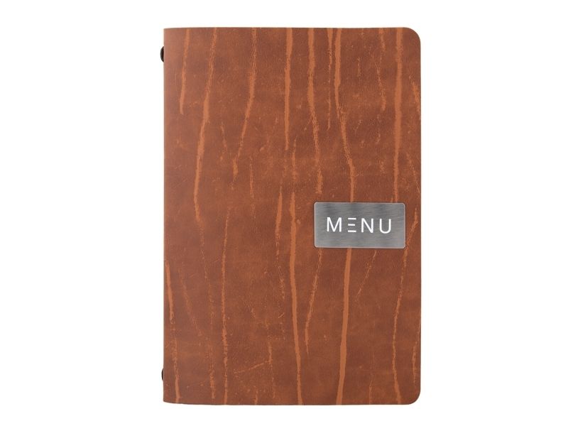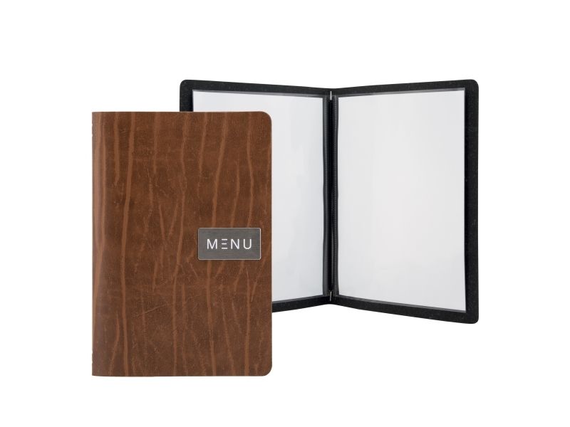 • Luksuriøst Securit® A5 brunt læder menuomslag til din restaurant, bar eller hotel. Dette menuomslag er fleksibelt, nemt at rengøre og passer perfekt til ethvert bord. En trykt metalplade med "Menu", en blank metalplade og en dobbeltsidet lomme til 4 x A5 sider inkluderet. Menuholderen kan let indeholde op til 40 x A5 sider med Securit® Menu lommer.