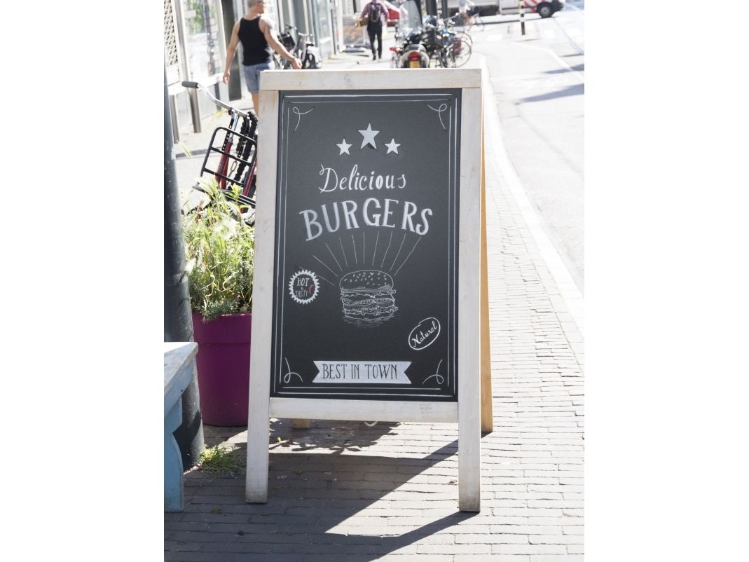 Securit® Deluxe A-skilt er et populært valg for caféer, barer, restauranter og butikker. Bliv kreativ og giv dit budskab et personligt præg, som let kan ændres i løbet af dagen. Dette store A-skilt til alle vejrforhold har en ridsefast UV-sikker skriveflade og en solid tredobbelt lakeret gummitræs ramme med rustfri stålbeslag. Ideel til såvel udendørs som indendørs brug og designet til at modstå vind op til 40 km / t. På regnvejrsdage anbefaler vi, at du bruger Securit® vandfaste kridtmarkere, som nemt kan fjernes med Securit® rengøringsspray. Ved tørt vejr kan du bruge Securit® Original kridtmarkere. Fås i forskellige størrelser og farver.