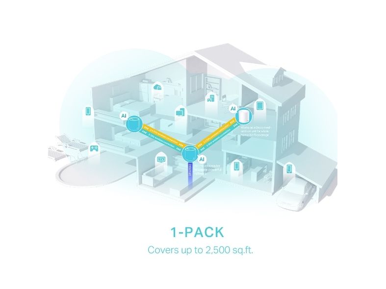 With clearer and stronger signals enhanced by BSS Color and Beamforming, Deco X50 boosts broader whole home WiFi coverage with great performance. Wireless connections and optional Ethernet backhaul work together to link Deco units, providing even faster network speeds and truly seamless coverage. Want more coverage? Simply add another Deco.