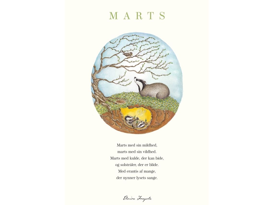 Månedsplakat for Marts.Med illustration og et lille digt, der passer til måneden.Illustration og digt er fra Elvira Fragolas bog "Året set gennem små øjne."