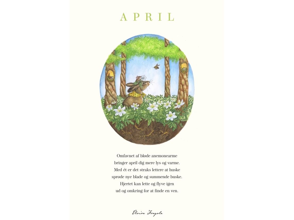 Månedsplakat for April.Med illustration og et lille digt, der passer til måneden.Illustration og digt er fra Elvira Fragolas bog "Året set gennem små øjne."