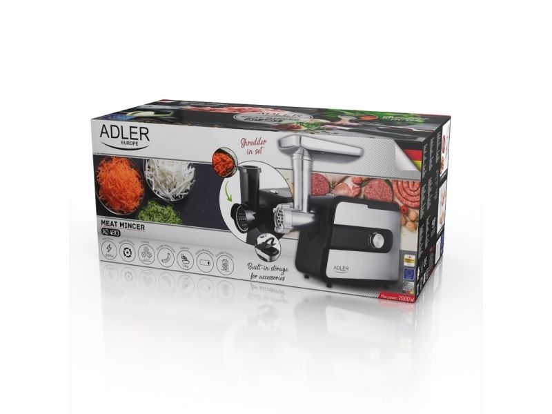 The machine also comes with a sausage attachment and a Kebbe attachment, which allows you to feel like a professional chef and take care of healthy food for the family. In addition to the grinding unit No. 5, sieves, slicer, and attachments, the device has a built-in storage compartment for accessories, which facilitates their convenient storage in one place. The machine is easy to install, and the stainless-steel cross knife guarantees many years of trouble-free use. The maximum power of the device is 2000 W, which means that you can quickly and effectively grind even large amounts of meat in a shorter time than when using a traditional grinder. The stainless-steel housing gives the device a stylish look and makes it easy to clean the product after use.Adler AD 4813. Power: 2000 W, Product colour: Black, Silver, Cord length: 1.05 m. Blade material: Stainless steel, Housing material: Metal, Plastic, Hopper material: Plastic. Power consumption (max): 600 W, AC input voltage: 220-240 V, AC input frequency: 50 - 60 Hz. Width: 280 mm, Depth: 195 mm, Height: 165 mm. Package width: 245 mm, Package depth: 500 mm, Package height: 210 mm