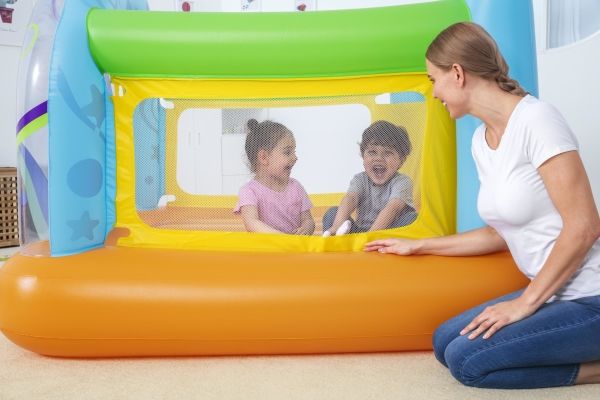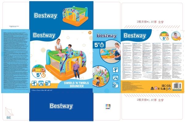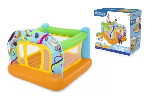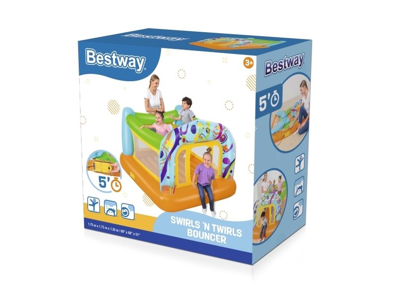 Bring home the funky fun of the Bestway Swirls ‘n Twirls Bouncer! The unique printing on this bouncer is sure to be a hit with the kids, who will love the groovy eye-catching, 3D graphics and colors. This bouncer also features a built-in pump, which inflates and deflates the bouncer in minutes with one press of a button, saving parents time and effort! This easy-to-set-up bouncer also has plenty of safety features that parents will love. The mesh sidewalls keep kids safe while also allowing parents to see them at all times. With only one opening for entry and exit, kids can safely play all day long. While they’re bouncing the day away, they’ll also be working on their gross motor skills, stimulating their imaginations and growing their confidence and communication skills. They’ll be having so much fun, they won’t even realize it! The Bestway Swirls ‘n Twirls Bouncer is the perfect year-round toy for endless fun.