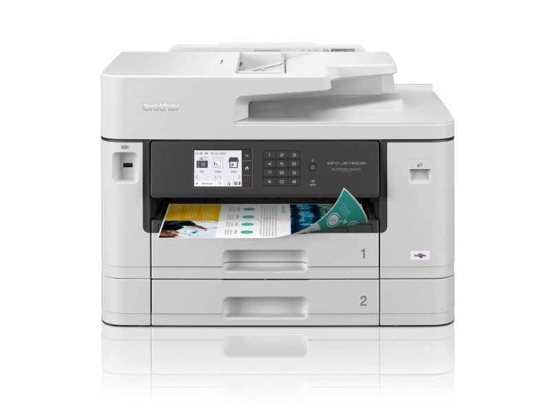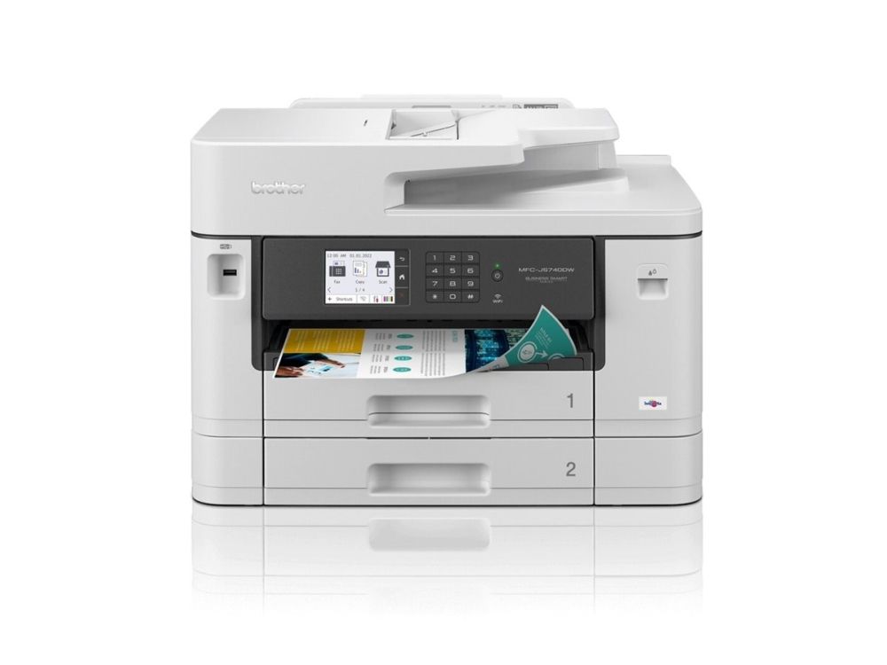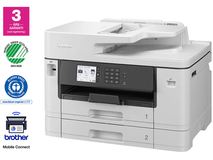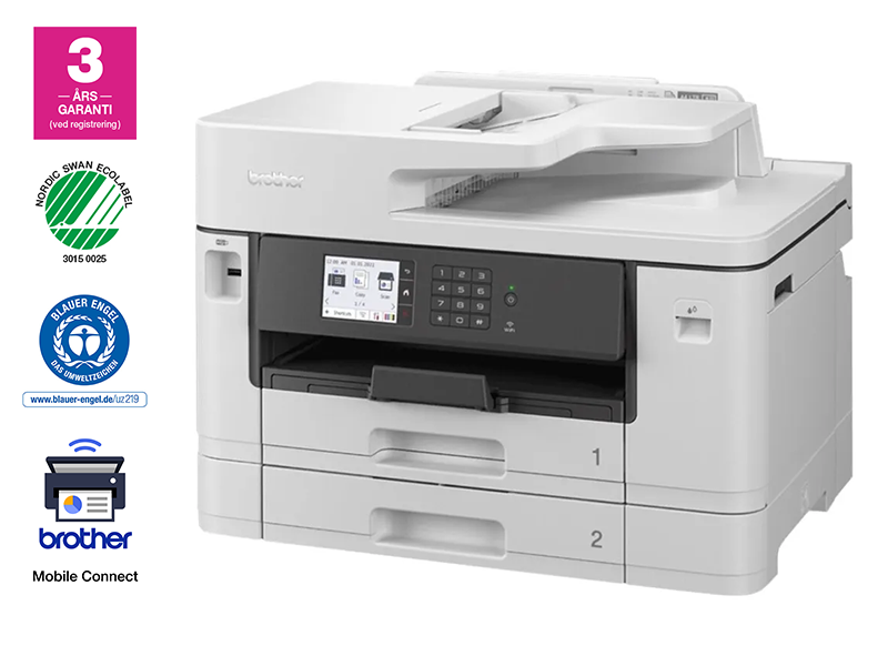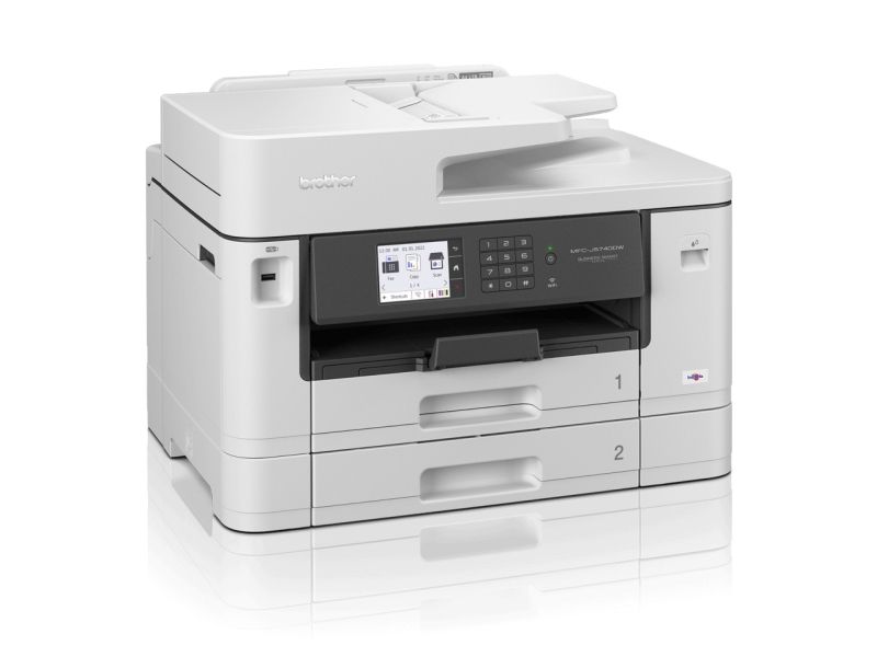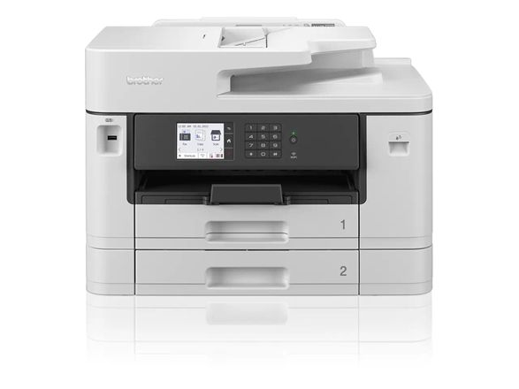 Den profesjonelle A3 alt-i-ett-skriveren MFC-J5740DW er bygget for å vare, og dekker behovene til krevende småkontorer og arbeidsgrupper. Med A3-funksjonen kan du produsere en rekke A3- og A4-fargedokumenter uten problemer, samtidig som du får utskrifter av høy kvalitet, høye utskriftshastigheter og lave driftskostnader. Denne multifunksjonsenheten har funksjoner for utskrift, kopiering, skanning og faks. Skriv ut fra arbeidsstasjonen, i et møterom eller fra en mobil enhet med trådløs tilkobling.