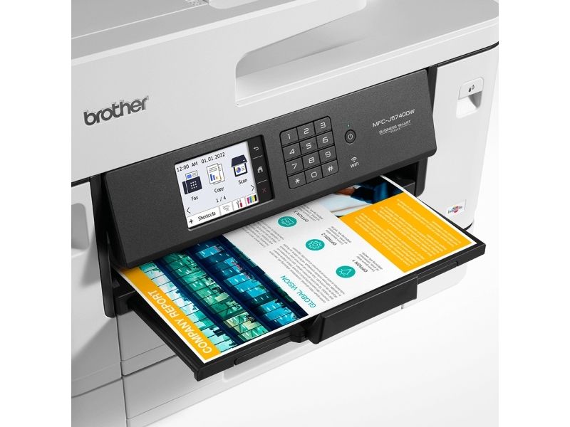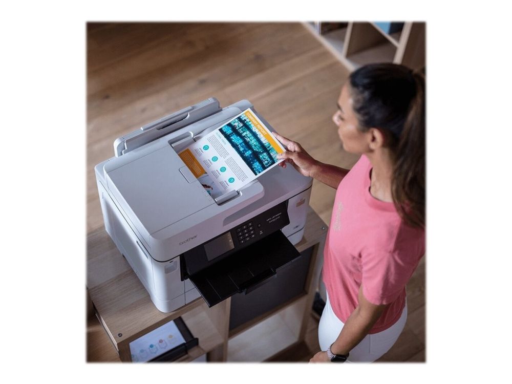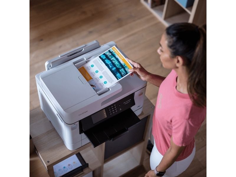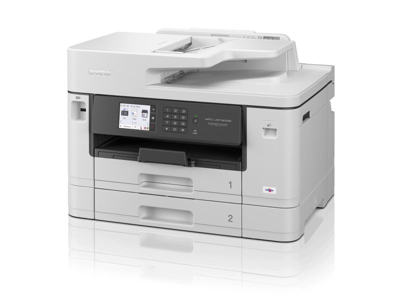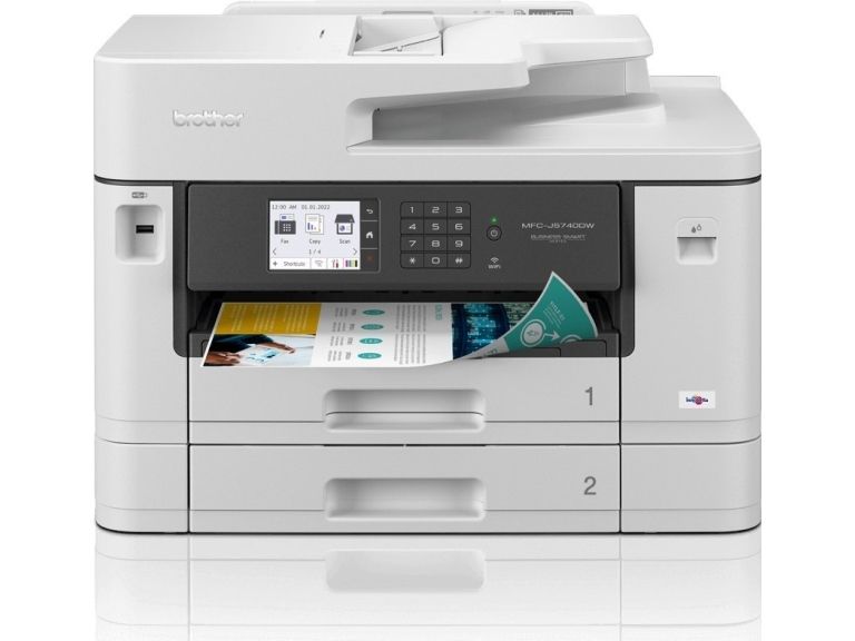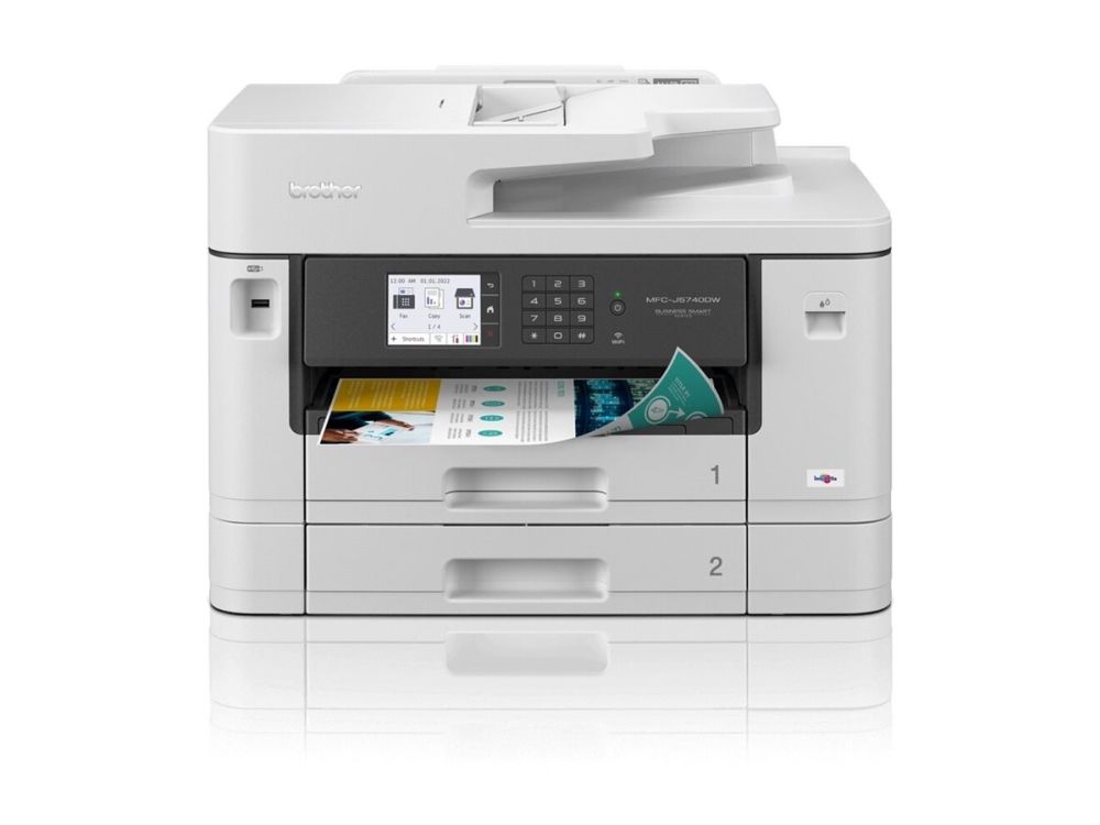 Den profesjonelle A3 alt-i-ett-skriveren MFC-J5740DW er bygget for å vare, og dekker behovene til krevende småkontorer og arbeidsgrupper. Med A3-funksjonen kan du produsere en rekke A3- og A4-fargedokumenter uten problemer, samtidig som du får utskrifter av høy kvalitet, høye utskriftshastigheter og lave driftskostnader. Denne multifunksjonsenheten har funksjoner for utskrift, kopiering, skanning og faks. Skriv ut fra arbeidsstasjonen, i et møterom eller fra en mobil enhet med trådløs tilkobling.