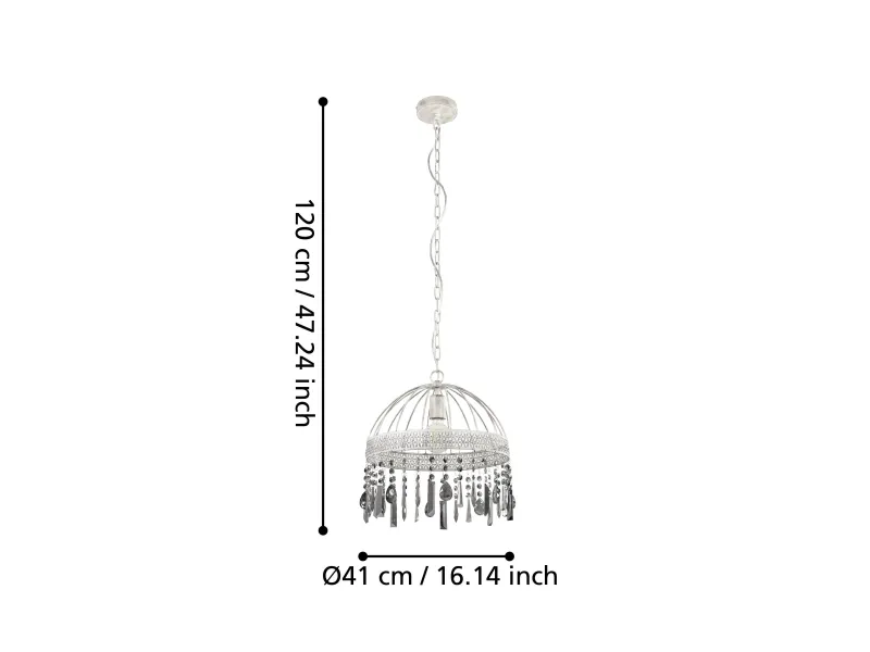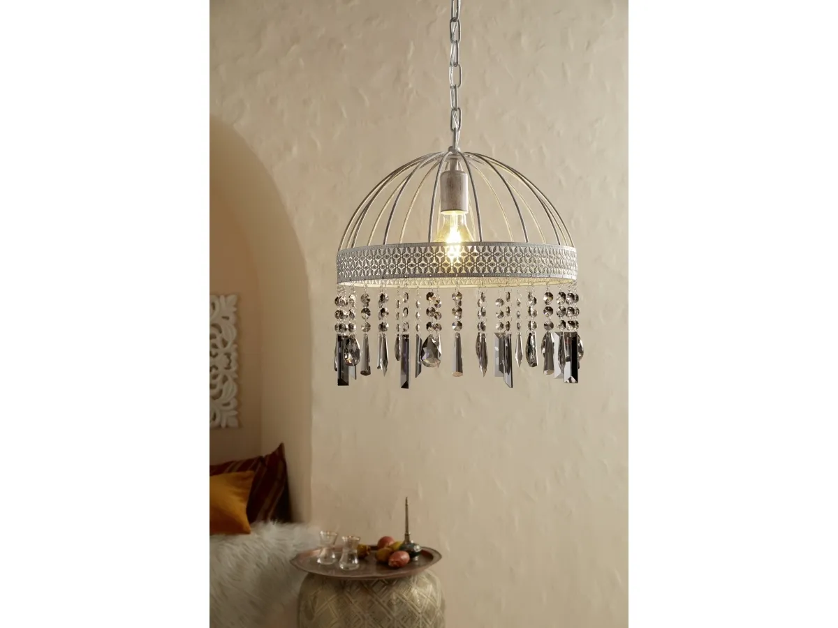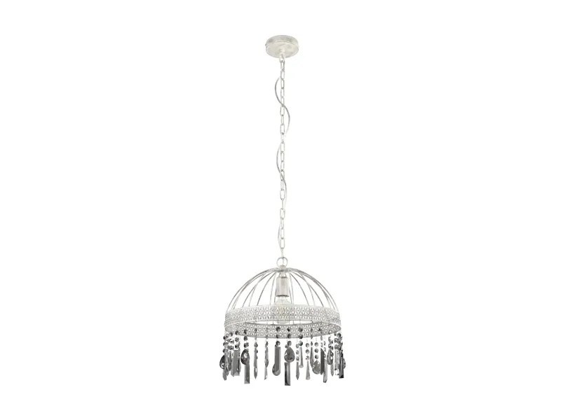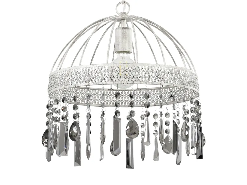 Pendellampen STEELEVILLE er fremstillet med en rund trådsæk i hvid-mat patina-look, som i den nederste del er forsynet med fine udskæringer. Gennem udskæringerne opstår diskrete florale mønstre, der giver lampen dens etno-stil. De sort-belagte brilleglaselementer (fumé), som hænger ned fra lampeskærmens nederste kant, skaber en elegant kontrast og sikrer et antikt og samtidig elegant udseende. Den unikke hængelampe med sin stilblanding af Ethno Elegance og Shabby Chic tilbyder en særlig belysning i rummet. Trådsækken skaber fascinerende lys- og skyggespil i stuen eller spisestuen over spisebordet. Det viste filament-pære medfølger ikke. Lampen passer til alle pærer med E27-fatning. STEELEVILLE pendlen er lavet med en rund trådskærm i et hvid-mat patina-look, som er forsynet med fine udskæringer i det nederste område. Udskæringerne skaber subtile blomstermønstre, der giver lampen sin etniske stil. De sortfordampede brillantglaselementer (fumé), der er ophængt i lampeskærmens nederste kant, giver et dygtigt brud i stilen og sikrer et antikt og samtidig elegant udseende. Den unikke hængende lampe med sin blanding af stilarter af etnisk elegance og shabby chic tilbyder særlig belysning i rummet. Trådskærmen skaber fascinerende spil af lys og skygge i stuen eller spisestuen over spisebordet. Den viste glødepære er ikke inkluderet i leveringsomfanget. Armaturet er velegnet til enhver pære med en E27-sokkel.