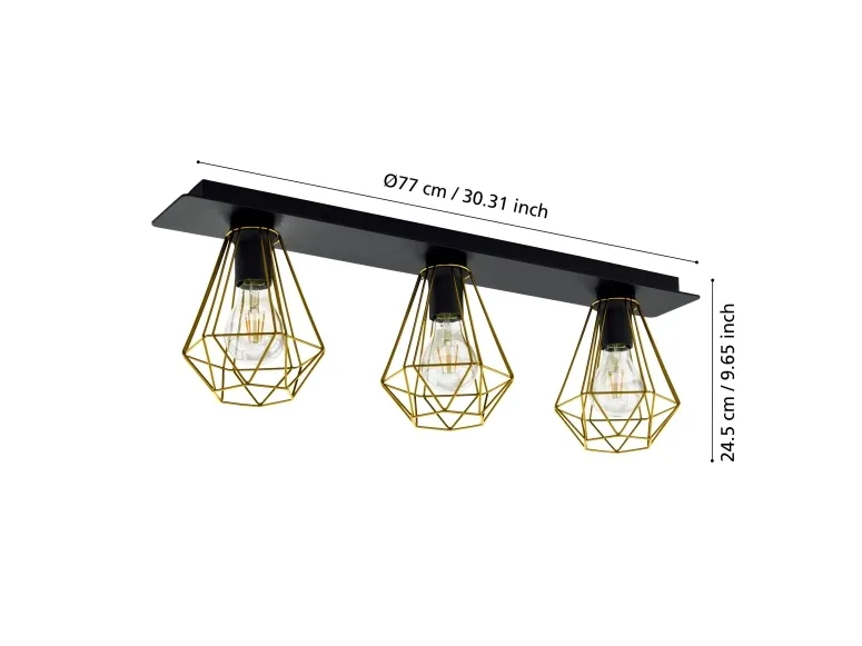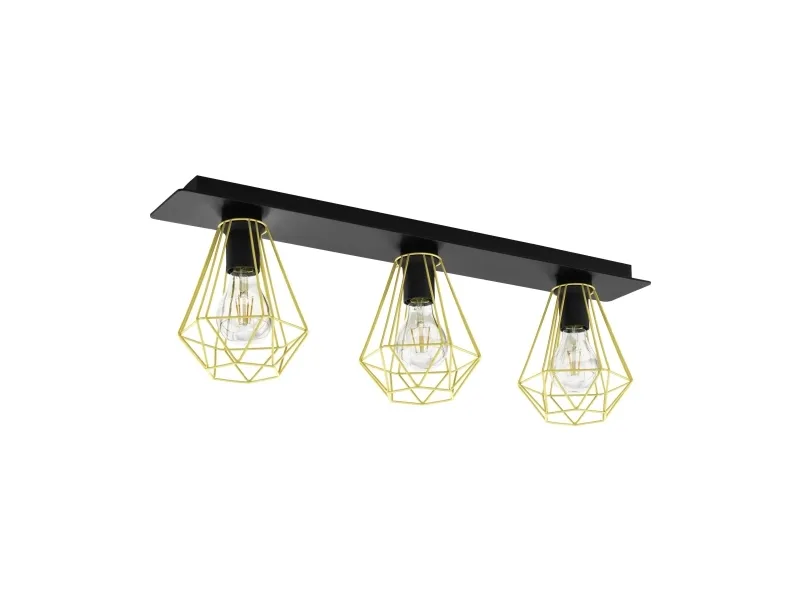 Loftlampen TARBES 2 er lavet af en rektangulær, sort metalbase med tre messingfarvede trådføringer i diamantform. De geometriske skærme skaber fascinerende lys- og skyggeeffekter, når lampen er tændt. Den moderne loftslampe giver en stilfuld belysning til ethvert rum – uanset om det er i køkkenet, stuen, soveværelset, gangen eller spisestuen. De viste filamentpærer er ikke inkluderet. Lampen er egnet til enhver lyskilde med E27-sokkel. TARBES 2 loftslampen er lavet af en rektangulær sort metalbase med tre messingfarvede trådskærme i form af en diamant. De geometriske nuancer skaber fascinerende spil af lys og skygge, når de er tændt. Den moderne loftslampe giver stilfuld belysning til ethvert rum - uanset om det er i køkkenet, stuen, soveværelset, gangen eller spisestuen. De viste glødepærer er ikke inkluderet i leveringsomfanget. Armaturet er velegnet til enhver pære med en E27-sokkel.