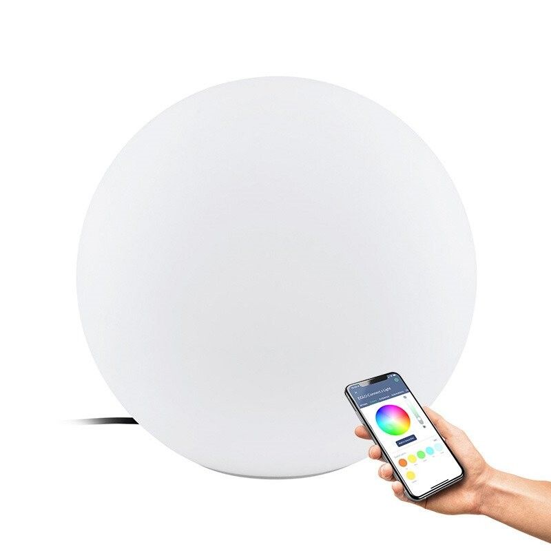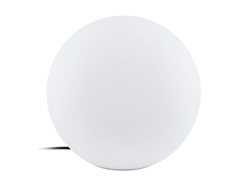 EGLO CONNECT-Z MONTEROLO-Z udendørs kugle i hvid. Med stik og 2 meter ledning. Højde 39 cm, diameter 39 cm. E27, 9 watt, 806 lumen, 2700-6500 kelvin, RGB + Tunable white. Lampen kan dæmpes og styres med fjernbetjening (medfølger ikke), via AwoX Home Control app (gratis), eller ved stemmestyring. Zigbee er kompatibel med Amazon Alexa og Google Assistent. IP65. Dette produkt indeholder en lyskilde med energieffektivitetsklasse: E.