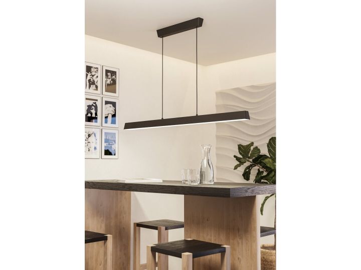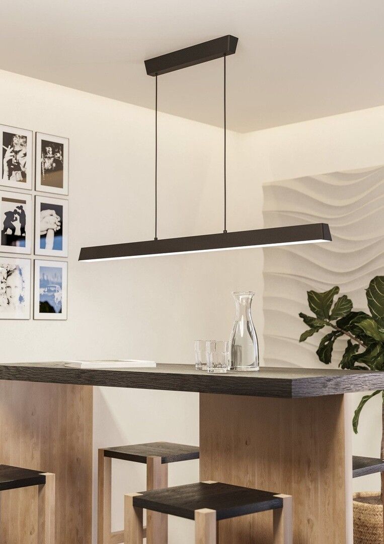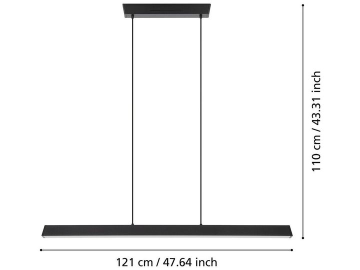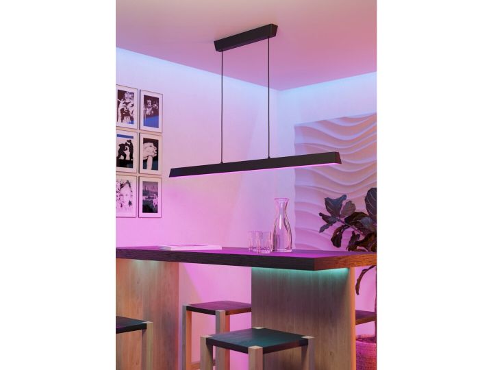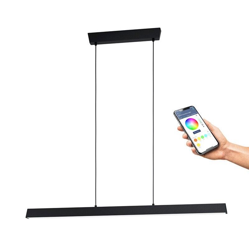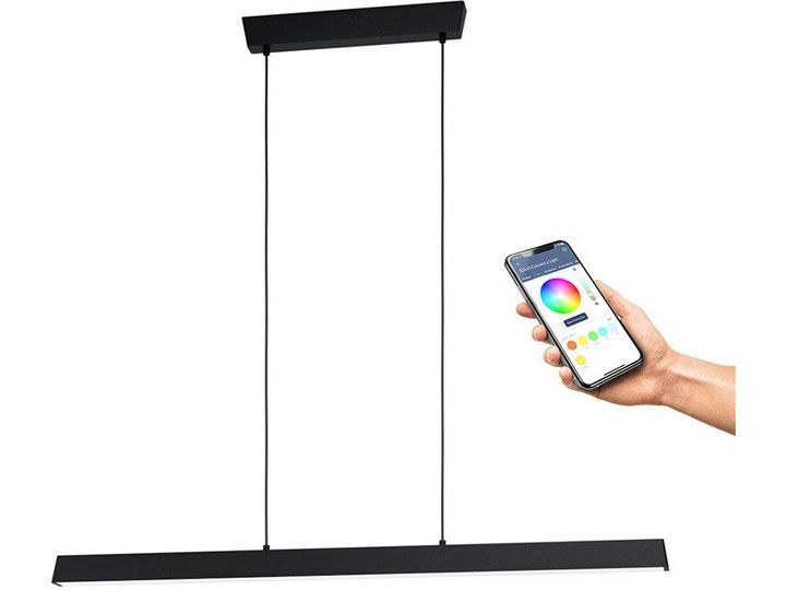 Serie: EGLO CONNECT-Z SIMOLARIS-Z Type: Smart lang bordlampe / pendellampe Farge: Svart Mål: L 122 cm x B 5,5 cm Lyskilde: 35 watt (integrert LED) Lysstyrke: 4200 lumen Lysfarge: 2700–6500 K (Tunable White) + RGB Dimbar: Ja (via app, fjernkontroll (valgfritt) eller stemmestyring) Kontroll: AwoX Home Control-app, Zigbee (Amazon Alexa, Google Assistant, Philips Hue) IP-klasse: IP20 Energieffektivitet: Klasse F