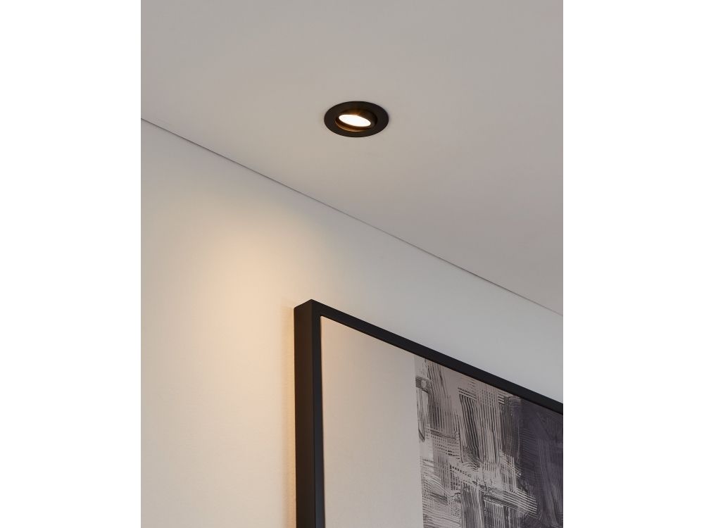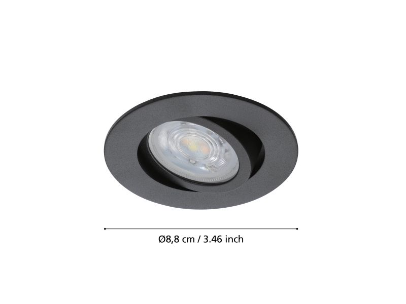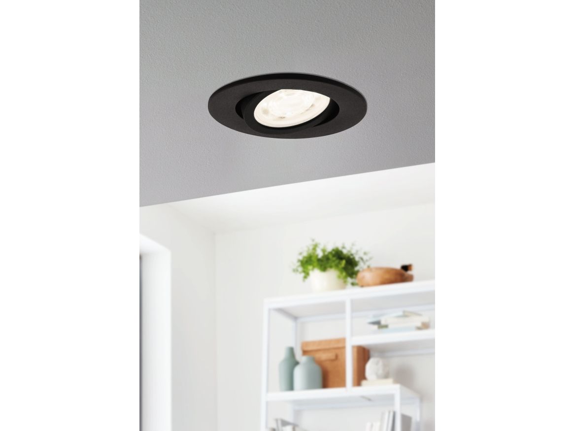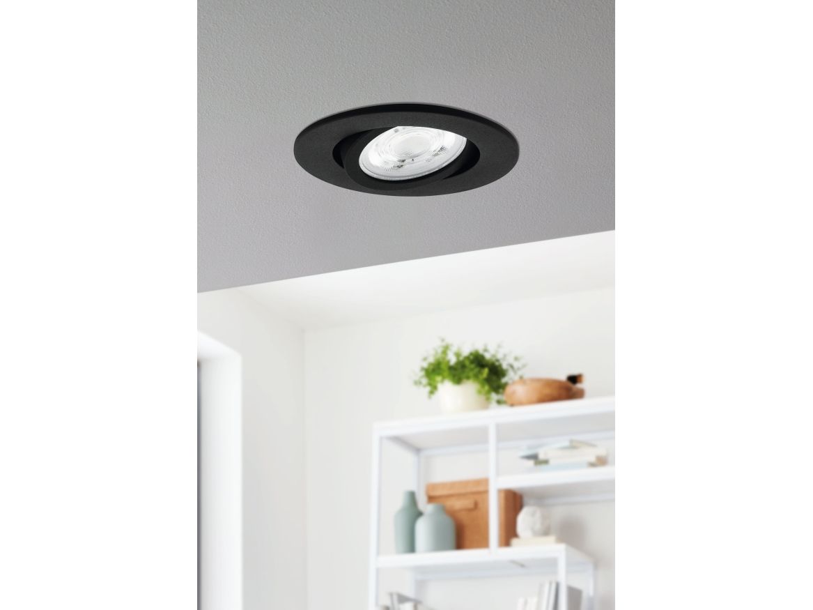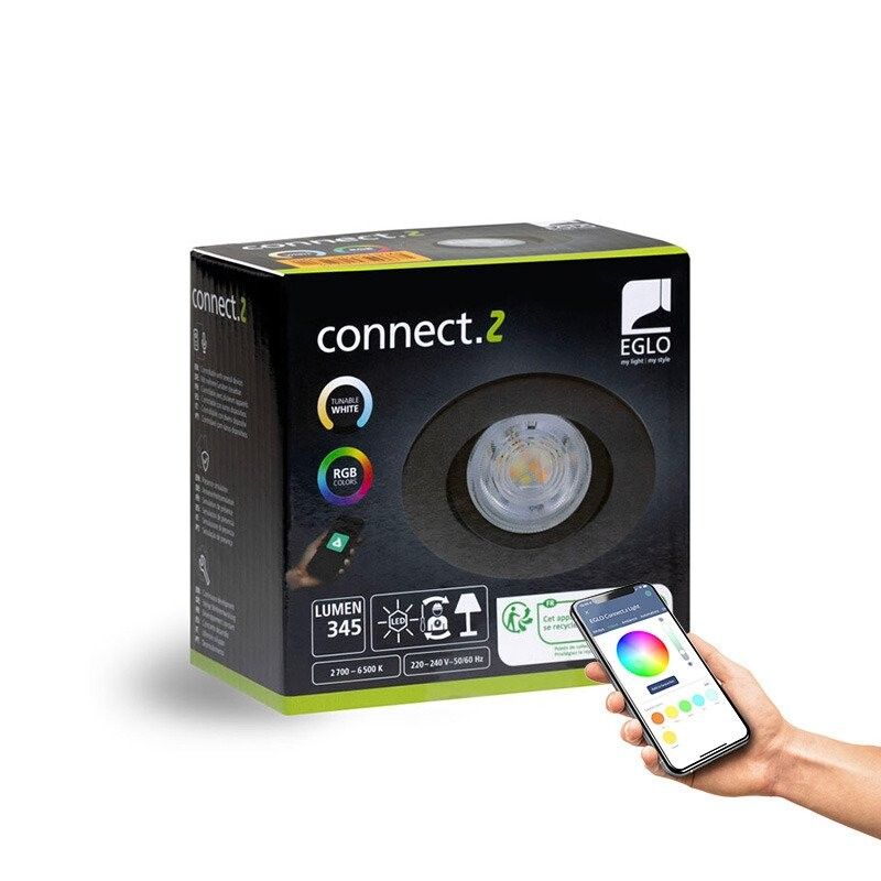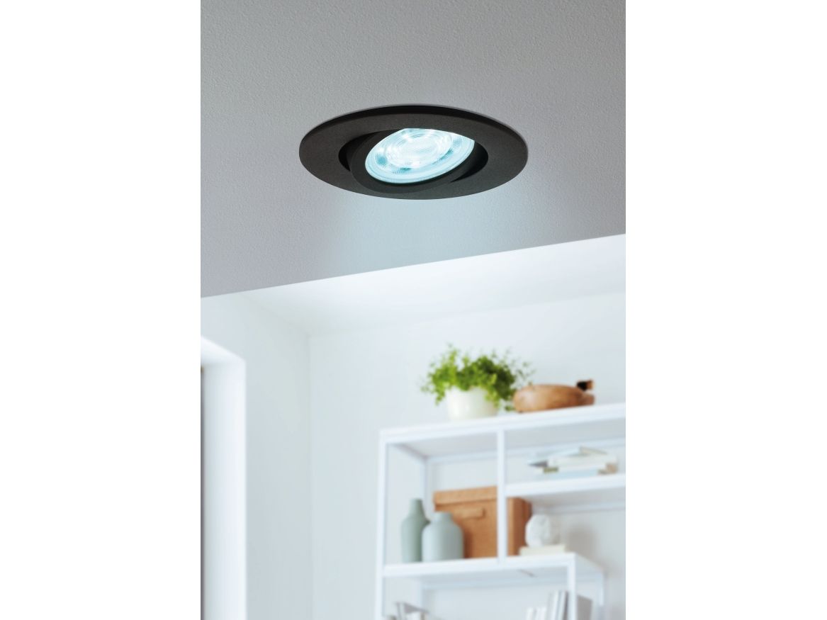 EGLO CONNECT-Z SALICETO-Z indbygningsspot i sort. Kipbar. Højde 4,6 cm, diameter 8,8 cm, Indbygningshøjde 5 cm, hulmål 6,8 cm. LED, 4,7 watt, 345 lumen, 2700-6500 kelvin, RGB + Tunable white. Indbygningsspottet kan dæmpes og styres med fjernbetjening (medfølger ikke), via AwoX Home Control app (gratis), eller ved stemmestyring. Zigbee er kompatibel med Amazon Alexa og Google Assistent. IP20. Dette produkt indeholder en lyskilde med energieffektivitetsklasse: F.