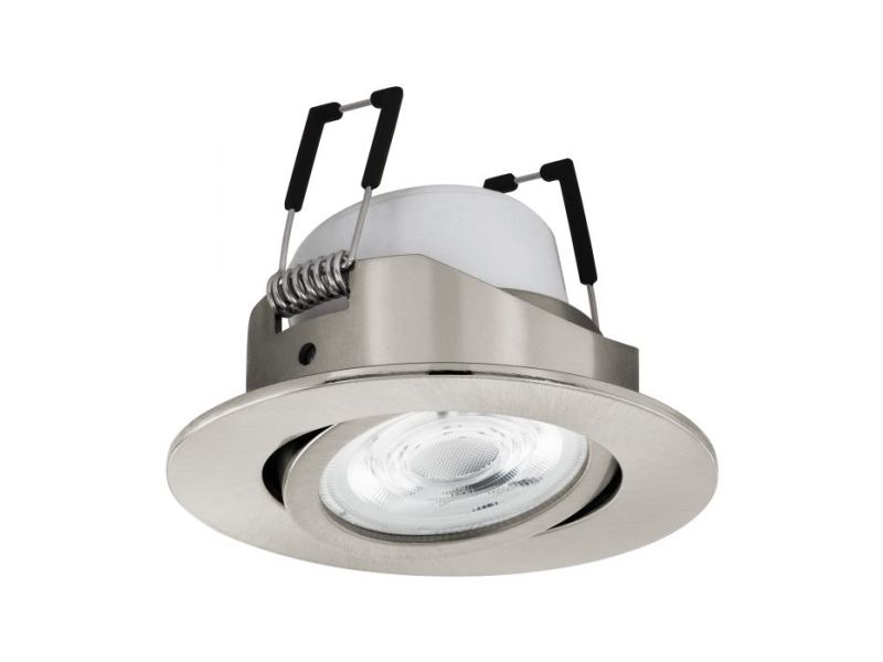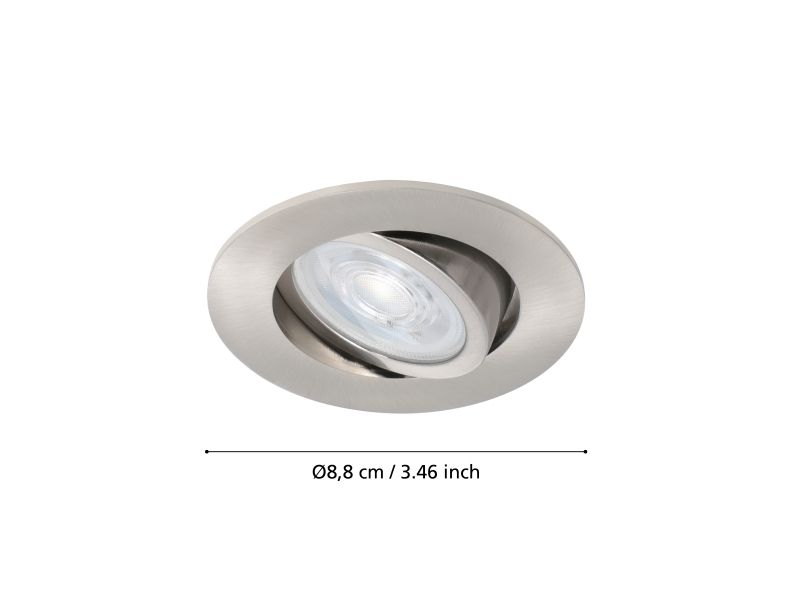 EGLO CONNECT-Z SALICETO-Z indbygningsspot i børstet stål. Kipbar. Højde 4,6 cm, diameter 8,8 cm, Indbygningshøjde 5 cm, hulmål 6,8 cm. LED, 4,7 watt, 345 lumen, 2700-6500 kelvin, RGB + Tunable white. Indbygningsspottet kan dæmpes og styres med fjernbetjening (medfølger ikke), via AwoX Home Control app (gratis), eller ved stemmestyring. Zigbee er kompatibel med Amazon Alexa og Google Assistent. IP20. Dette produkt indeholder en lyskilde med energieffektivitetsklasse: F.