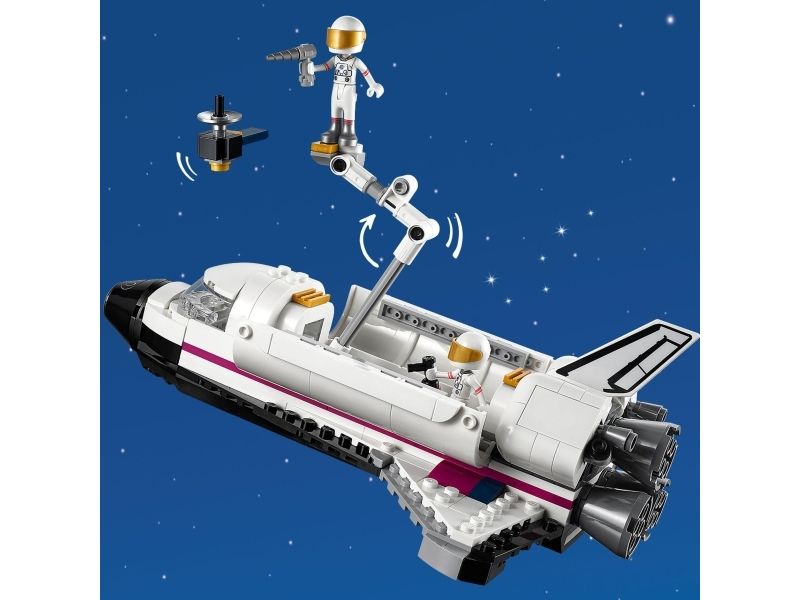 Pedagogisk leke fornysgjerrige barn Romfartsinteresserte barn vil garantert like denne LEGO romfergemodellen. Lasterommet har hengslede dører som kan åpnes, akkurat som i virkeligheten, og minidukkene kan festes til Canadarm-modellen når de skal utforske verdensrommet. Nede på jorden kan de utforske forskjellig utstyr, inkludert et teleskop, en aerotrim, et kontrollrom og et romgalleri med modeller av solen, jorden og månen som går i bane.