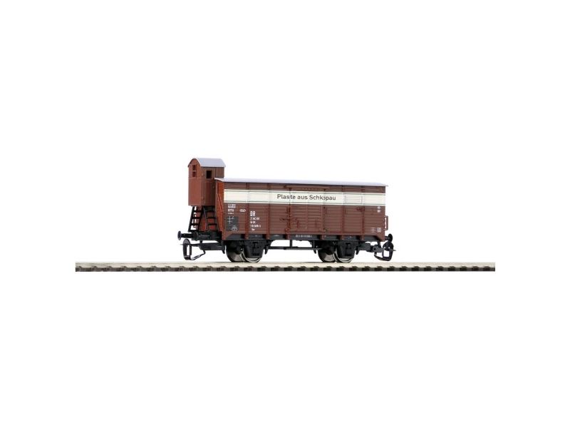 Variant af den overdækkede godsvogn type G02 med bremsehus fra DR med teksten Plast fra Schkopau. Nu er denne vigtige og holdbare klassiker fra den tidlige godstransport også repræsenteret i målestoksforholdet 1:120. PIKO modellen udmærker sig med sin originaltro, delskarpe print, nemt genkendelige træplanker, fremragende køreegenskaber og nøjagtigt afbildede bogier. Ekstra farve i vognparken leverer moderne udskrifter, for eksempel på tidspunkter med DR i epoke III som et attraktivt vognsæt.