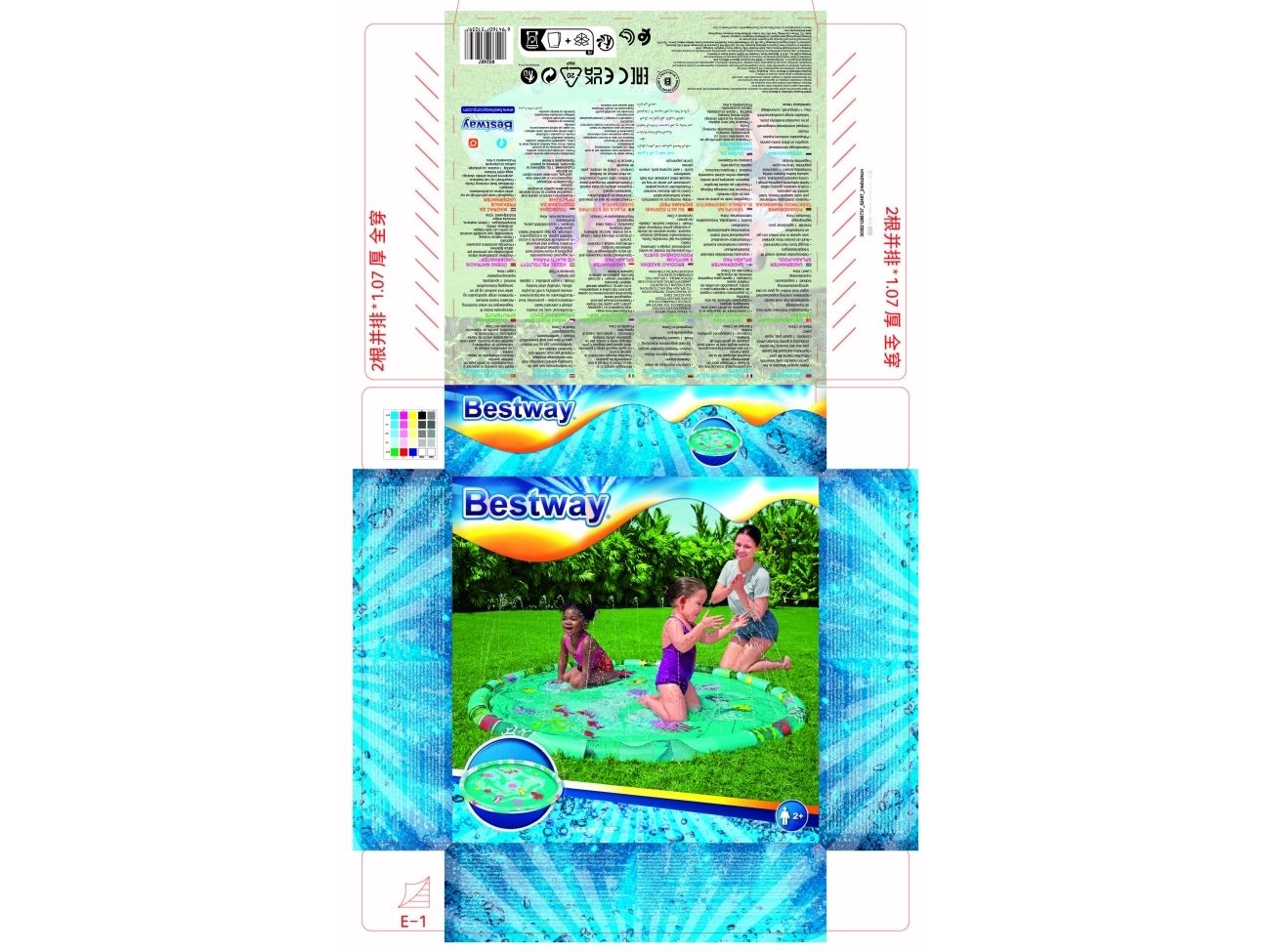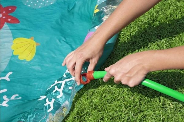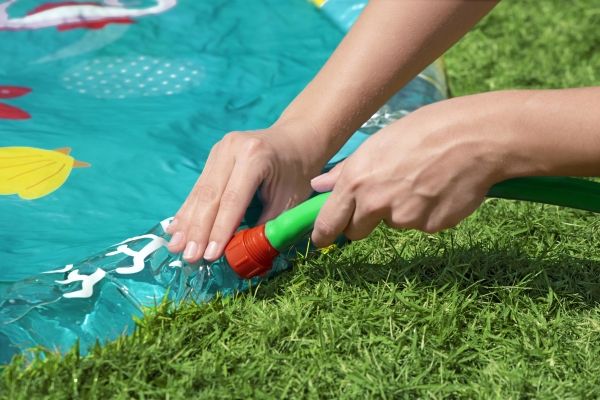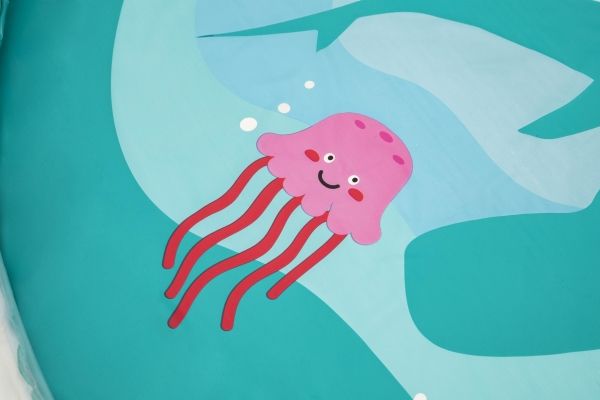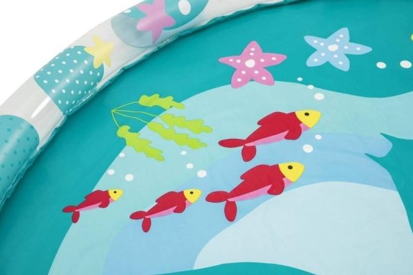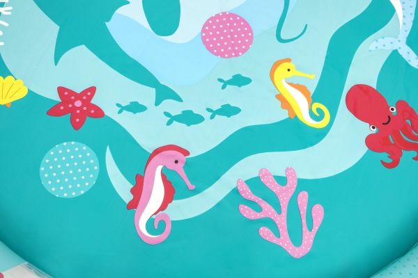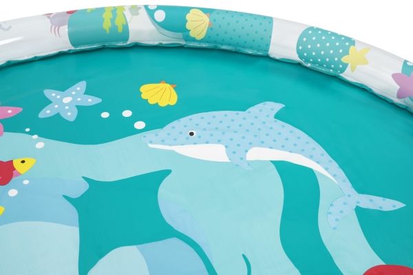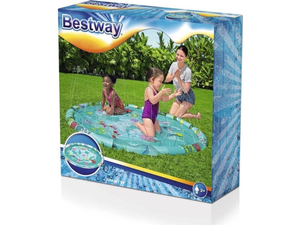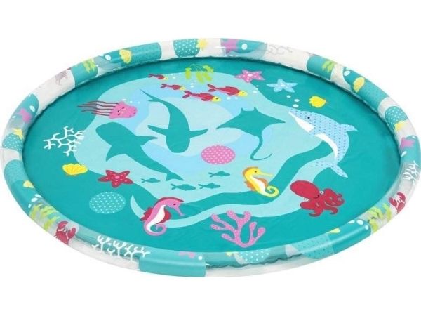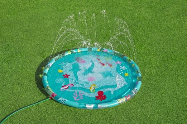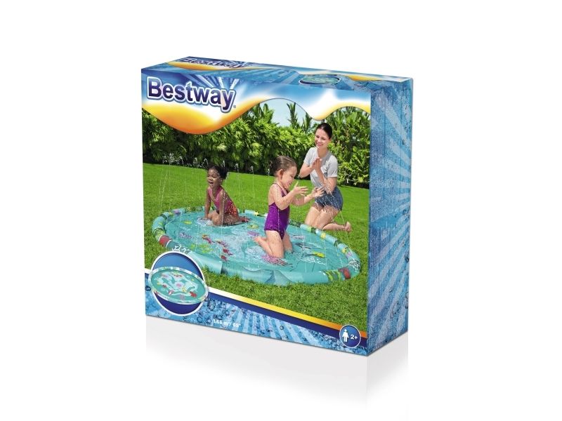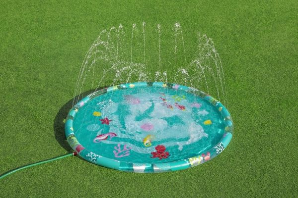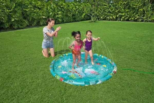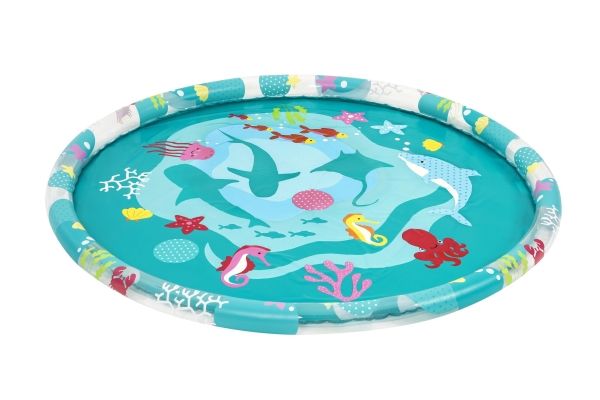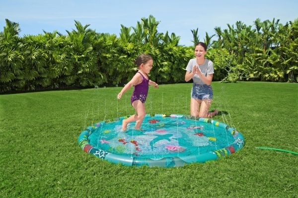 The Bestway Underwater Splash Pad is redefining backyard fun. Big and little kids alike will love the shallow splash pool created with the inflatable rim that surrounds the pad and traps the water for frolicking, splashing fun. Get ready to dance beneath a cascade of cool water! Just hook up your garden hose to create the gentle streams that will not only inspire play and imagination, but also keep everyone cool under the warm summer sun. Jump, splash or wade in the water as you wiggle and dance beneath the sprinklers that aim towards the center of the pad, creating a fun fountain effect. Kids will be captivated by the attractive marine-life print, and parents will enjoy the easy set-up and safe water play. Everyone will find something to enjoy with this exciting Underwater Splash Pad.