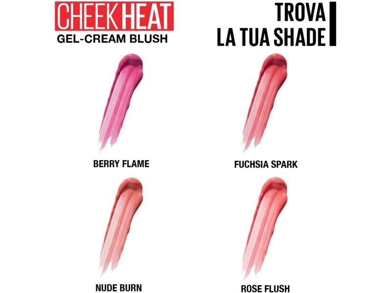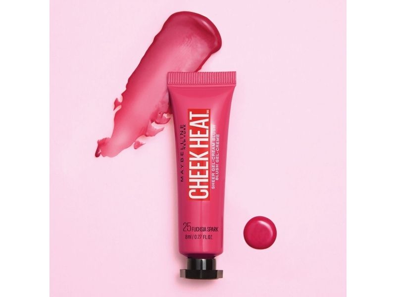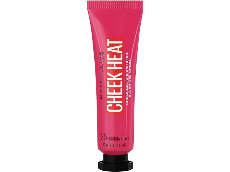 Cheek Heat is a water-based gel cream Maybelline blush infused with colorful pigments that create a buildable, natural looking blush. Available in three natural looking blush shades! Fuchsia Spark is a warm berry pink, Nude Burn is a mauve-toned nude and Pink Scorch is a light cool pink.
