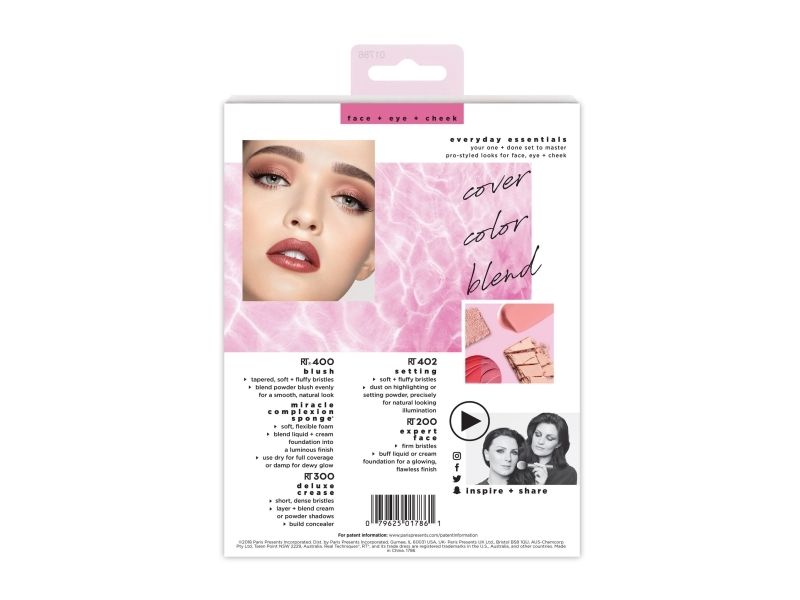Your one and done set for everyday makeup looks. Look for the color orange! Also, our makeup sponge is egg-shaped with a point tip at the bottom and angular, planar portion at the top. These trademarks are a sign of Paris Present Incorporated quality.