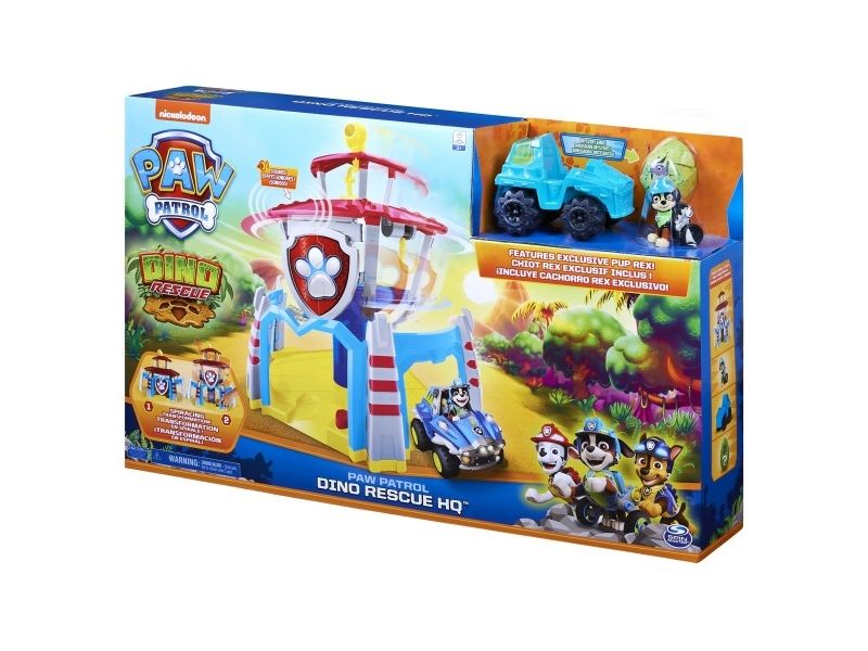 Create your own exciting dino rescue missions with the PAW Patrol Dino Rescue HQ! Featuring sounds and a spiraling transformation into tower mode, this awesome playset looks just like the high-tech headquarters from the show! The Dino Rescue HQ has everything you need for your missions, including an exclusive Rex figure and vehicle, plus a mystery mini dino figure. Unbox the mystery figure from the packaging to discover a colorful dinosaur to use in all of your rescue adventures! Park Rex’s vehicle in the base of the headquarters and place Rex at the top of the lookout. Then, instantly transform the playset from dome to tower by pushing the button – the top lifts and spins, rising up into tower mode, just like in the show! With a working periscope at the top of the tower, you and Rex have the perfect vantage point to spot dinos in trouble! Next, activate the Dino Rescue HQ’s sound effects by pressing the button inside Rex’s Lab! When it’s time to rescue a dino friend in trouble, attach the grapple hook onto Rex’s backpack to quickly send him down into action! For more dino-sized fun, add all of the Dino Rescue Pup and Dino Packs (each sold separately) to your collection. Play out your own dino missions again and again with the PAW Patrol Dino Rescue HQ!