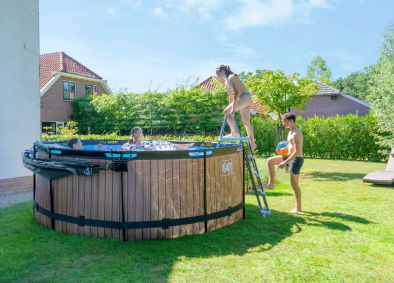 Altid klar til en svømmetur Find ud af, hvor robust en rund pool over jorden kan være: Det pulverlakerede stålstel og de robuste ben på EXIT Wood poolen sikrer, at poolen altid forbliver stabil og holder i årevis. Den medfølgende pumpe frisker vandet op, og holder det i bevægelse for at forhindre, at det bliver forurenet. Filterpumpen er let at montere på poolen, og filterpatronerne sørger for, at vandet forbliver pænt og rent. EXIT Wood poolen er altid klar til en svømmetur!
