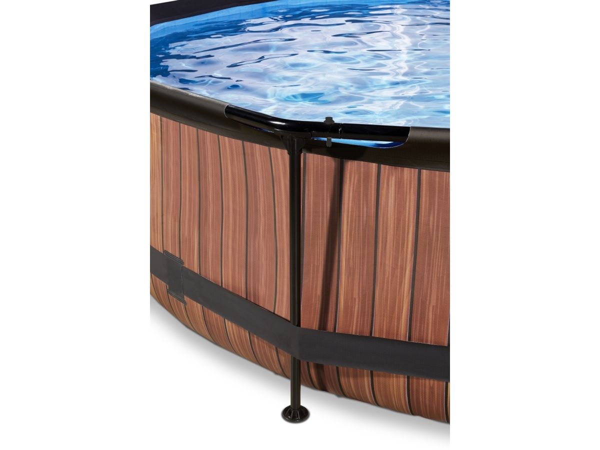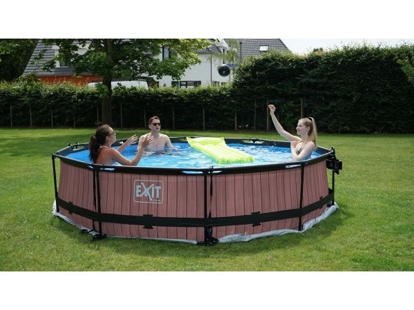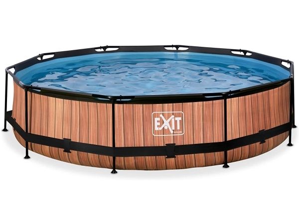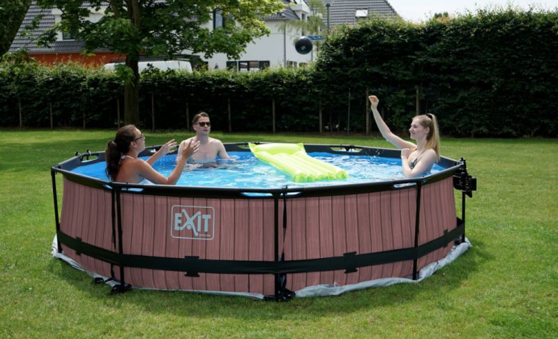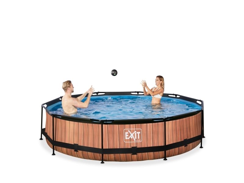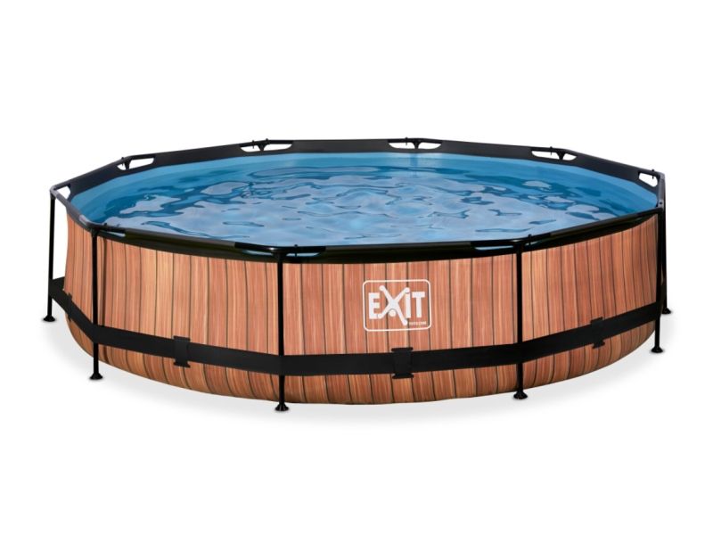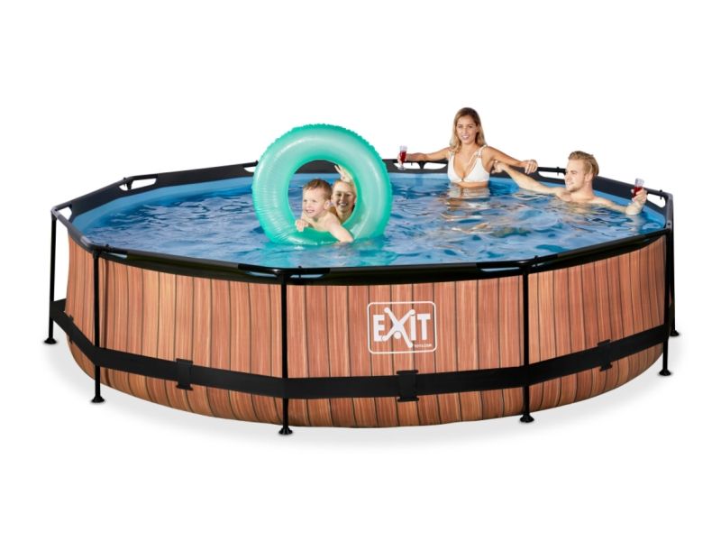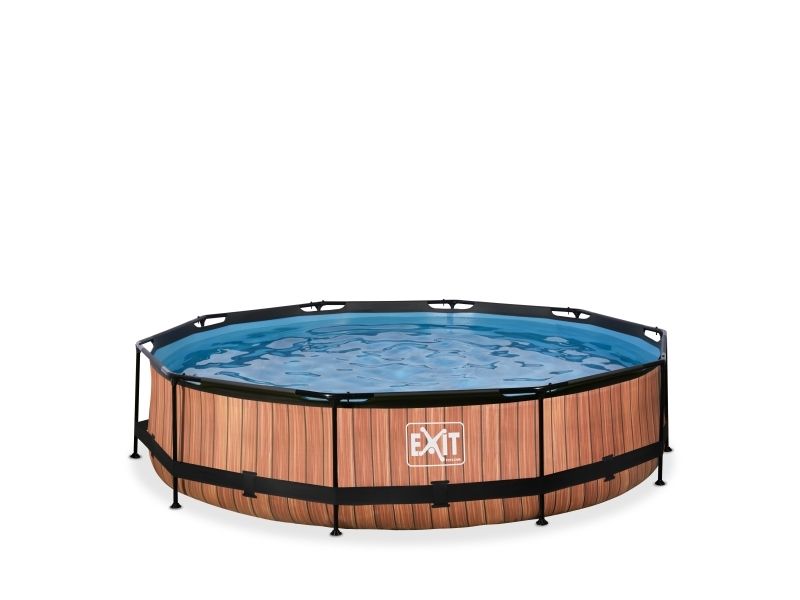 The EXIT Wood pool is a round frame pool with wooden look. The pool contains a filter pump and really stands out with its cool wood pattern. The powder coated steel frame and the sturdy legs of the EXIT Wood pool ensure that the pool always remains stable and will last for years. The included pump refreshes the water and keeps it moving to prevent it becoming polluted. The filter pump is easy to mount to the pool and the filter cartridges make sure the water remains nice and clean.