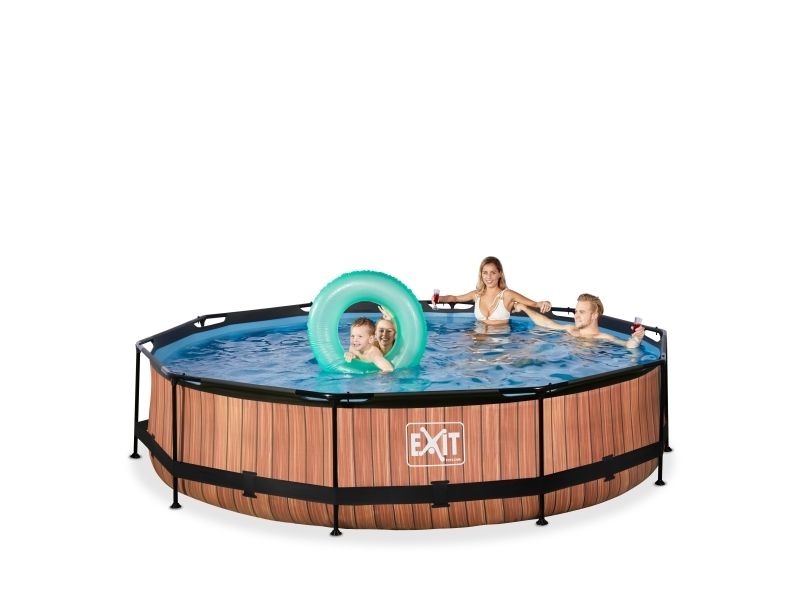 EXIT Wood pool ø360x76cm med filterpumpe - brun EXIT Wood poolen med ø300x76cm er en stor rund fritstående pool, der ligner træ. Poolen indeholder en filterpumpe og skiller sig ud med sit flotte træmønster. Leder du efter en sjov, men også en unik fritstående pool i høj kvalitet til din have? Kom i centrum med de runde pools fra EXIT Toys!