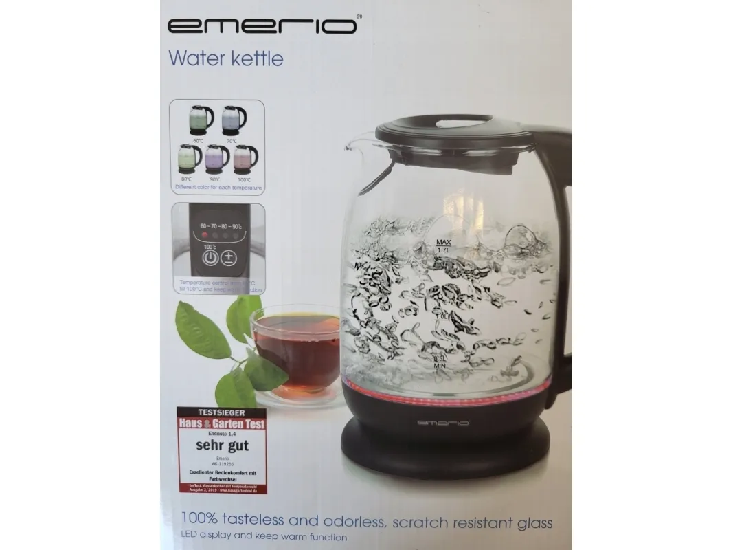 Discover a blend of style and functionality with the Emerio WK-119255.5 kettle. This small kitchen appliance is designed to elevate your kitchen experience, featuring a 360-degree connector base and cordless pouring for convenience. With its sleek design, the kettle boasts LED illumination, adding a modern touch to your space while ensuring ease of use with its external water level indicator. The variable temperature control allows you to adjust the heat from 60°C to 90°C, complemented by a keep warm function to maintain the perfect temperature for your beverages. Safety is prioritized with an automatic switch-off feature, and the kettle's compliance with Directive 2012/19/EU assures you of its environmental friendliness. Powered by a robust 2.2 kW, it heats water quickly, ensuring you're never too long away from your comforting cup. Make the Emerio WK-119255.5 kettle a staple in your kitchen for both its aesthetic appeal and its performance.