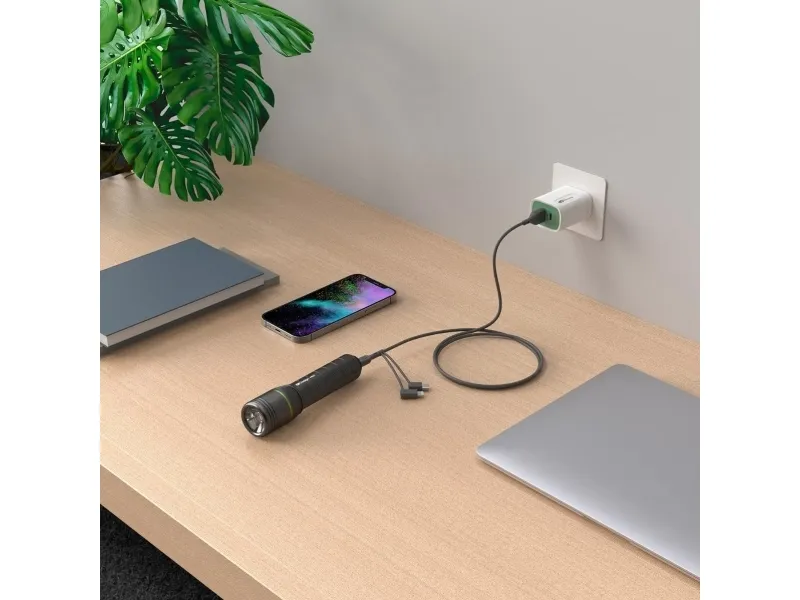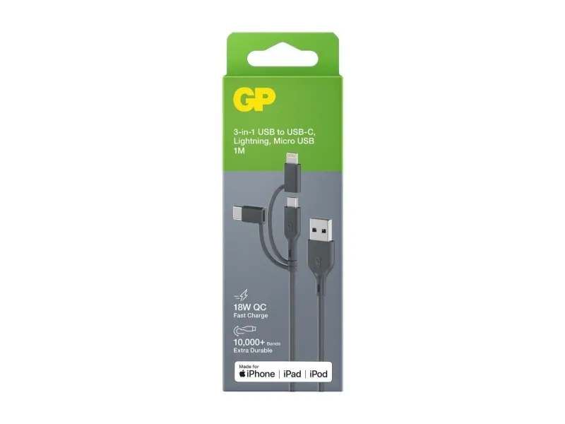 GP 3-i-1-kabel med micro-USB, Lightning og USB-C™Hvorfor gøre tingene komplicerede, når de kan være enkle? Med dette 3-i-1-oplade- og datakabel med mikro-USB-, Lightning- og USB-C™-tilslutninger, bliver opladning og overførsel af data meget nemmere. Forskellige tilslutningsstik gør separate kabler overflødige.Ekstra holdbart 3-i-1 USB-ladekabelUdviklet til at møde udfordringerne ved den daglige anvendelse med bravour. Fremstillet af TPE, et yderst fleksibelt materiale, kan kablet udvides over 10.000 gange og bøjes uden at gå i stykker.Hurtig 3-i-1-USB-ladekabelHurtig og effektiv Bare en praktisk løsning, der gør det lettere at udveksle data samt at oprette forbindelse og anvende forskellige tilslutningsstandarder. Med dette 3-i-1-kabel kan du uden besvær skifte mellem USB-C™-, Lightning- og mikro-USB-enheder. Den praktiske længde på 1 meter er ideal for anvendelse ved skrivebordet, i sengen eller på farten.GP 3-i-1 USB-ladekabelVælg en langvarig ydeevne og ultimativ sikkerhed. I mere end 50 år har GP-batterier været en energikilde i verden. Med engangsbatterier og genopladelige batterier samt med batteriopladere, powerbanks, data- & ladekabler, USB-opladere og bærbar belysning. GP produkter er pålidelige, billigt og ideal for allround-indsats.