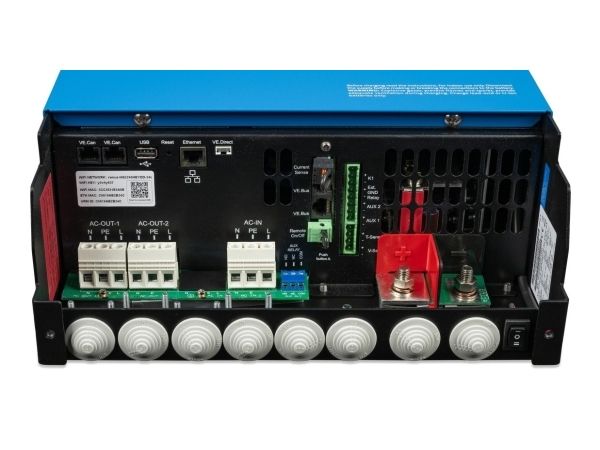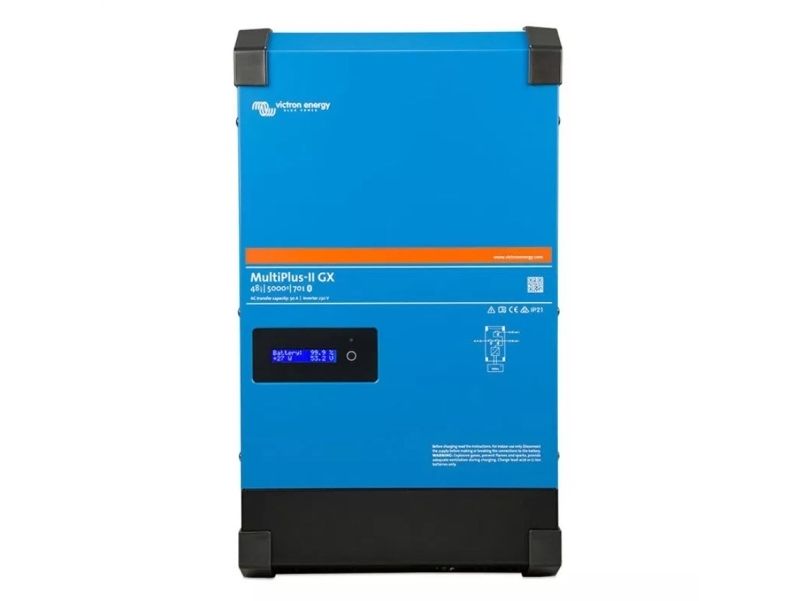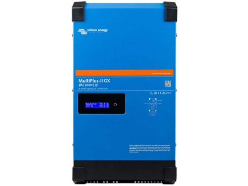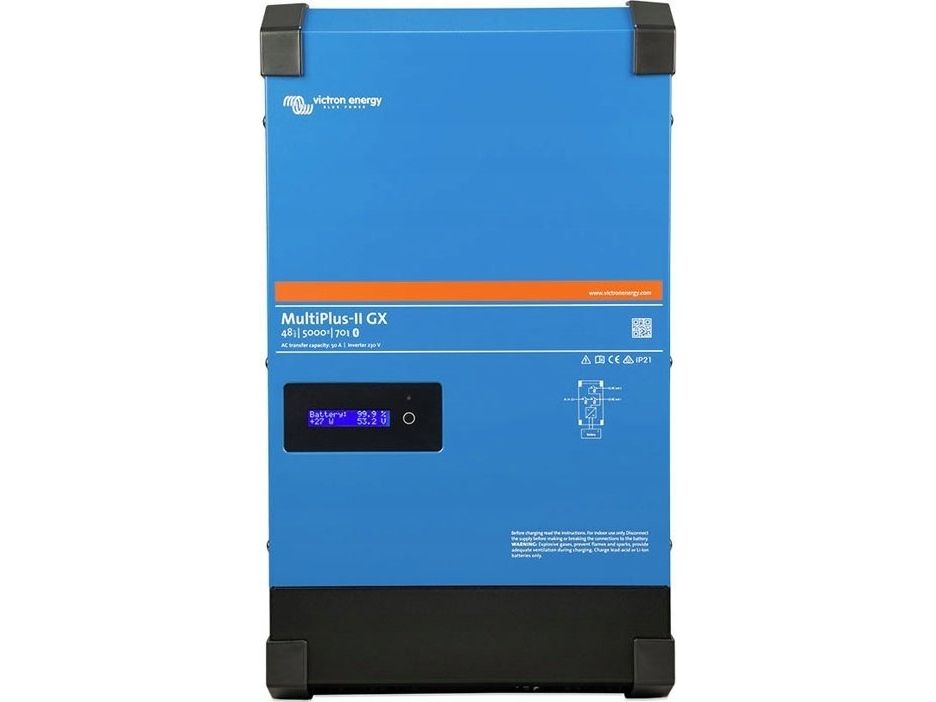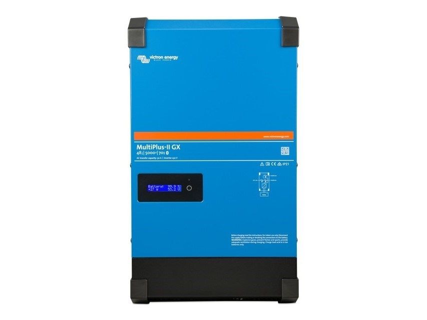 Vekselretter/oplader MultiPlus-II 48/5000/70-50 GX Integreret GX-enhed · VE.bus-interface · 2 vekselstrømudgange · interface RS232; USB; Ethernet · til parallel- og tre-fase-drift, fjernovervågning og systemintegration · pålideling og holdbar kvalitet · integreret opladningsregulator · høj virkningsgrad · PowerAssist · høj tilkoblingseffekt · programmerbart relæ · fjernstyret tænd/sluk mulig · søgetilstand Kortslutningssikker · temperaturkontrol · Overbelastningsbeskyttelse · alarm-funktion · LED-skærm · polvendingsbeskyttelse · overvågning og styring på afstand Overopladningsbeskyttelse · batteriskånende tilstand · to jævnstrømsudgange · temperaturkompensation · automatisk udligningsladning · lager-tilstand · robust stålkabinet · fastgørelsesøskner