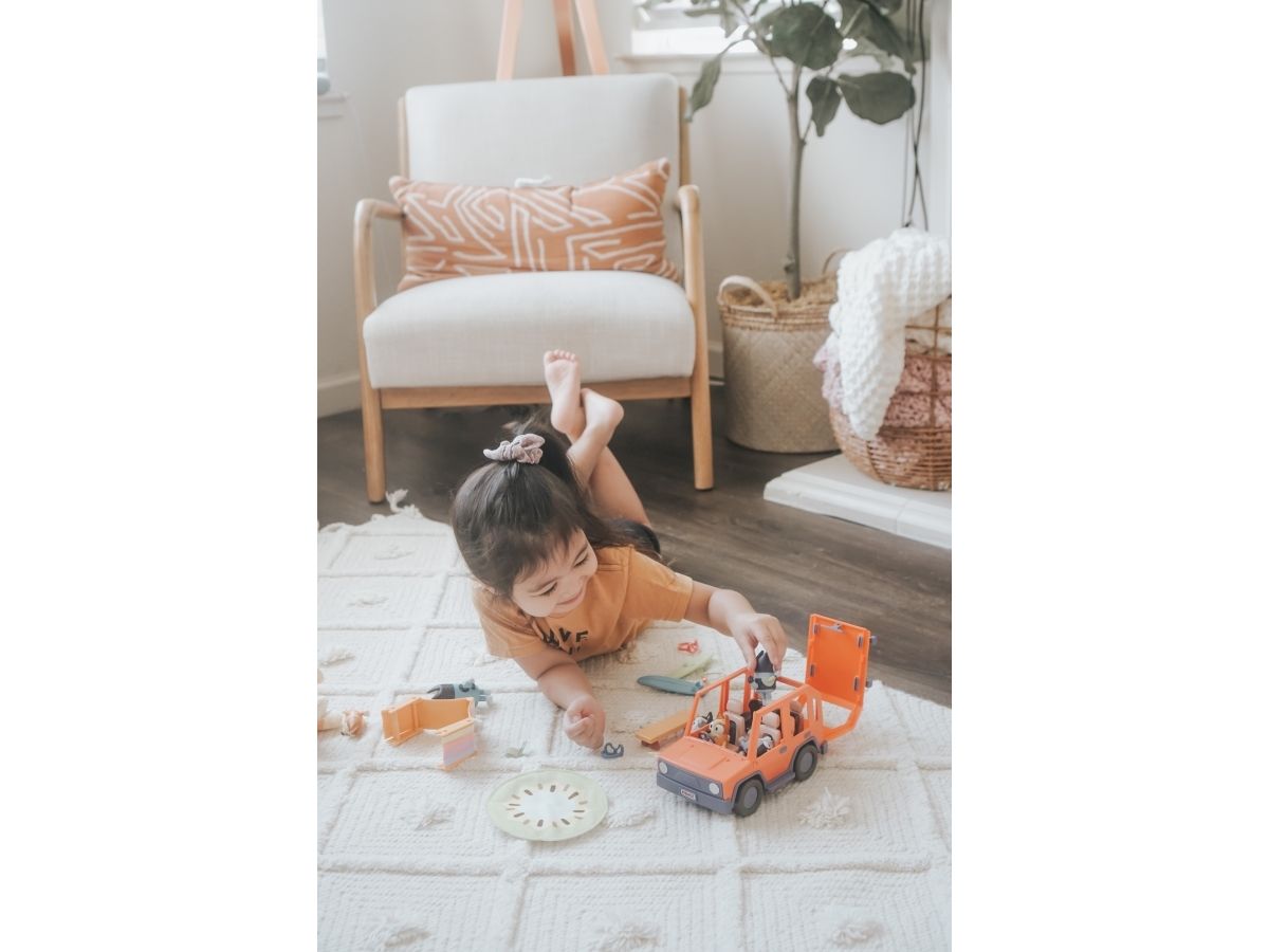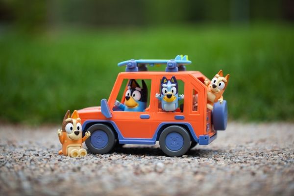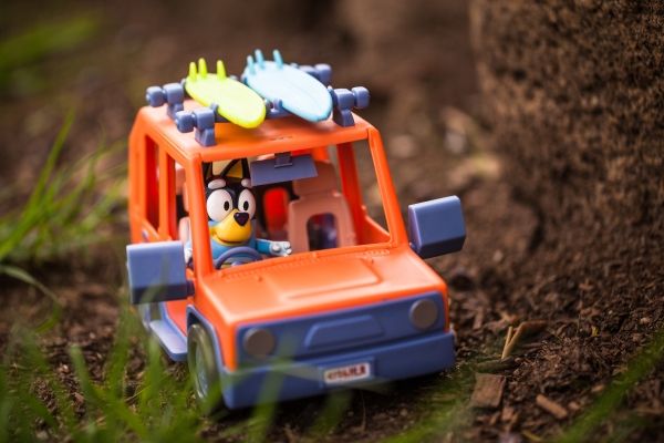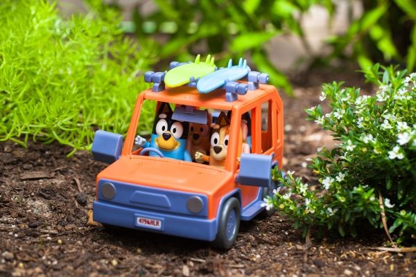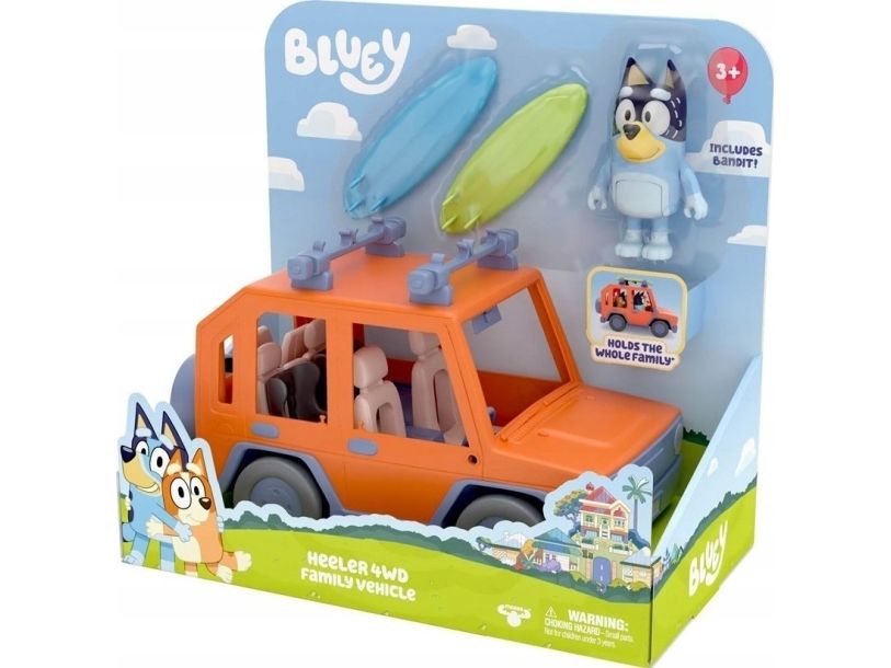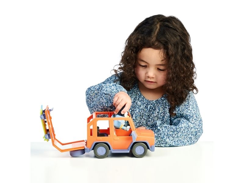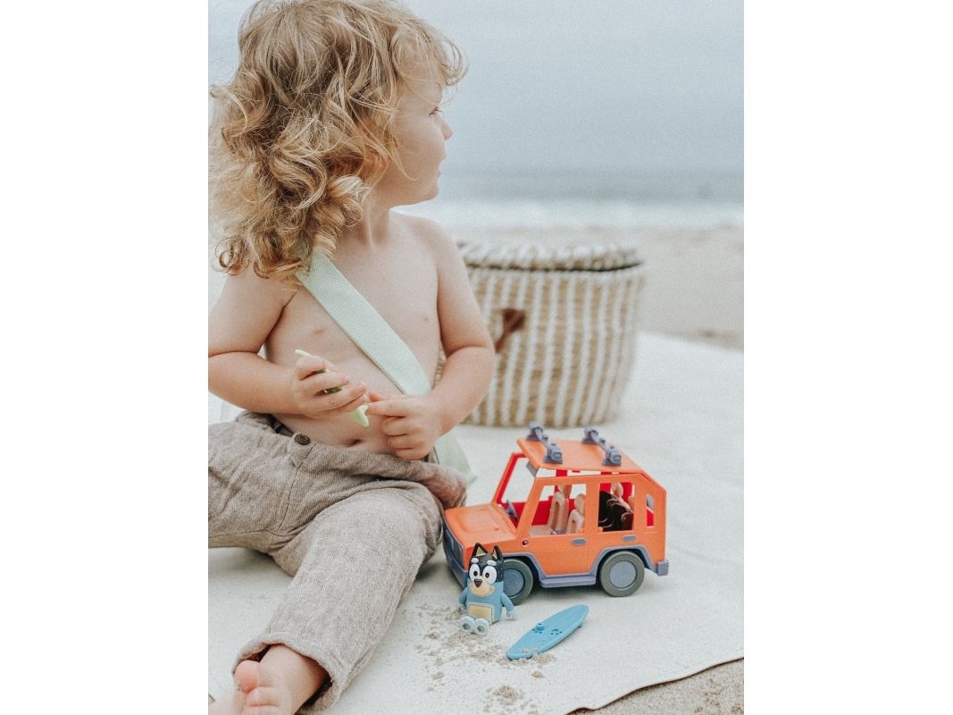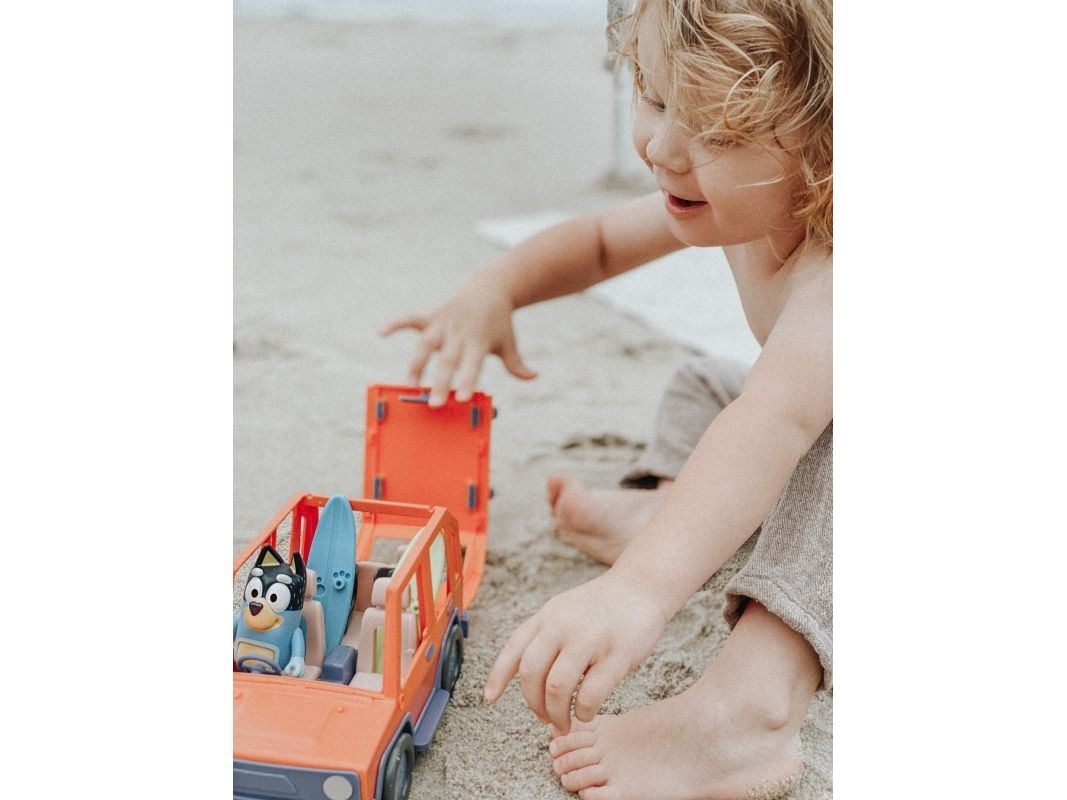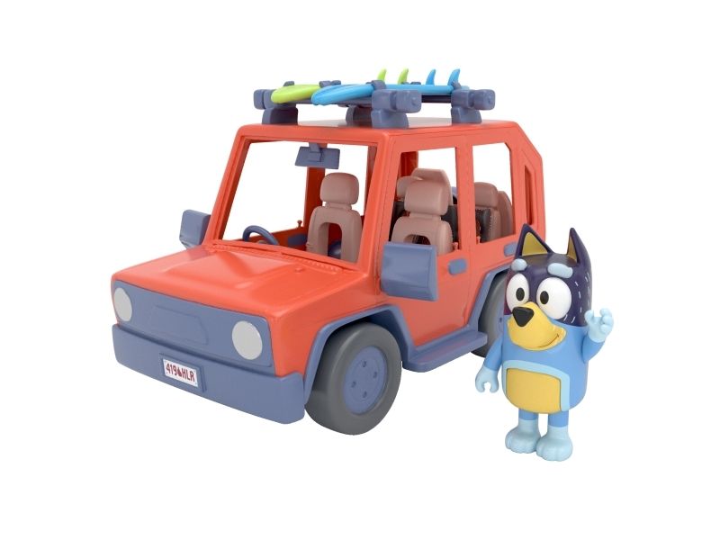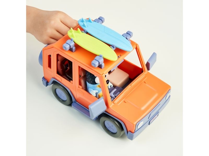 Bluey Familie Cruiser inkl. 2 surfbrætter. I bilen er der plads til hele Bluey familien. Så ta’ med på turen, hvor mon vi skal hen?