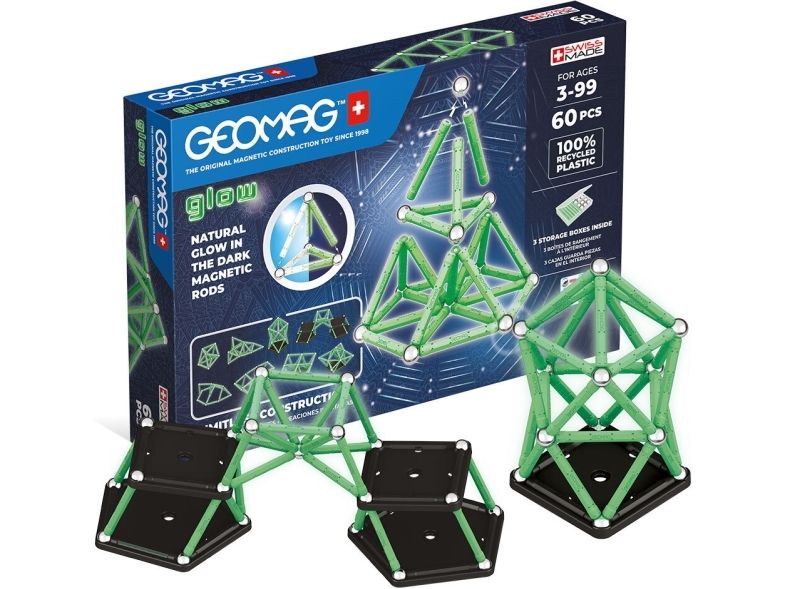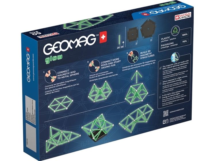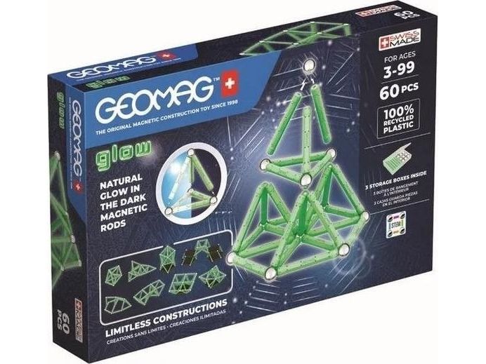 Geomag er læring gjennom lek for alle aldre. Når du bygger og monterer med magnetene stimuleres kreativitet og fingerferdighet. Og det er også stressreduserende! De fluorescerende elementene i dette Glow-settet får designene dine til å lyse klart i mørket. Så skru på kreativiteten og gi konstruksjonene den formen du ønsker. Dette settet inneholder 60 selvlysende elementer og er laget av 100% resirkulert plast. Fra 3 år.