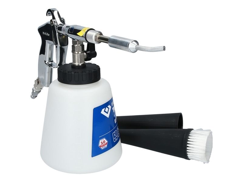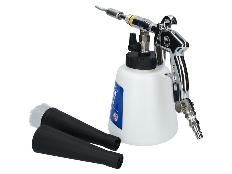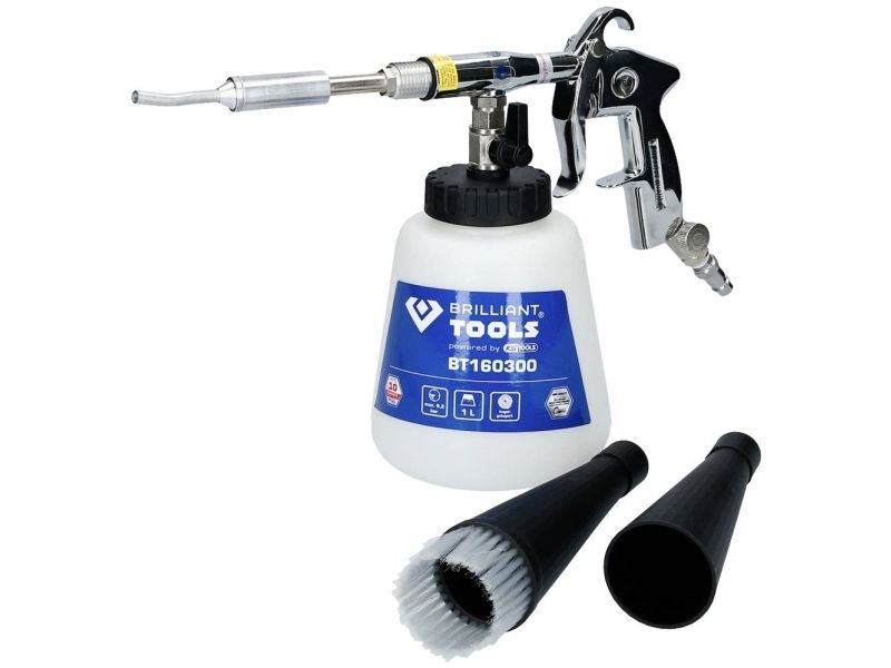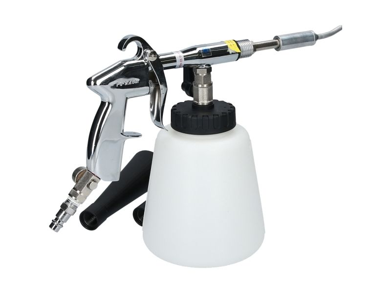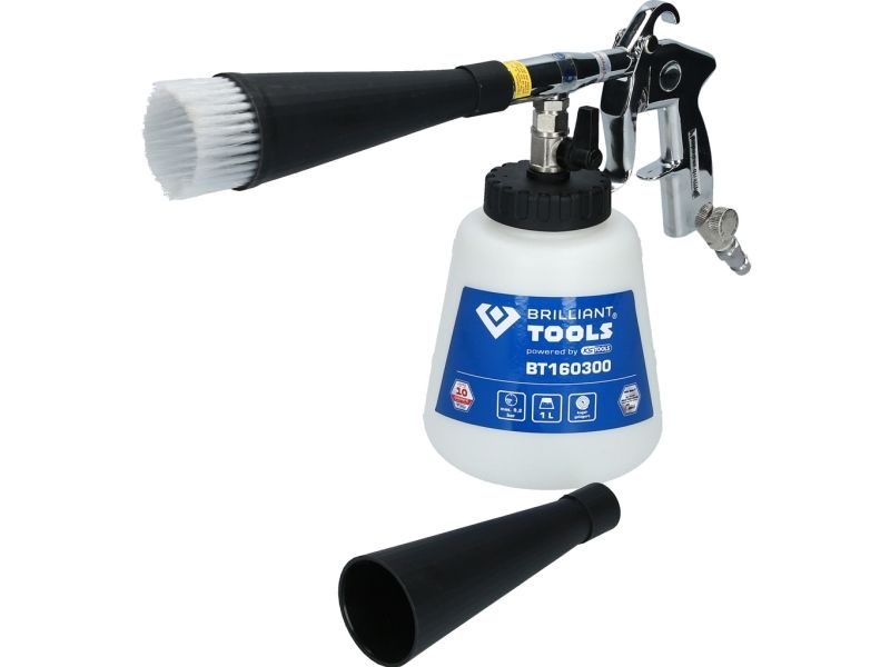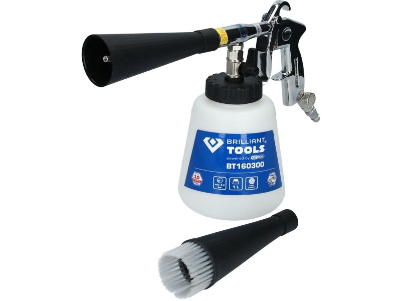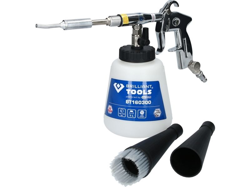 Til rengøring af stærkt snavsede overfladerEgnet til alle typer af blandingsrengøringsmidlerMed den integrerede stophane er den også egnet til tørring efter rengøringMed trykregulermit af denne Brilliant TOOLS trykluftrengørings-pistol BT160300 kan du legende let fjerne selv genstridige pletter og snavs fra alle mulige overflader. Med det buede metalrør i luftningstragten kan den gennemstrømmende luft hvirvles kraftigt, og der opstår et rengøringsog. Dette rengøringsog sørger for en ekstremt stor snavsopløsningseffekt, der også fjerner genstridige partikler fra overfladen. Ved at dreje på trykregulatoren, ved enden af håndgrebet, kan pistolens arbejdstryk reguleres trinløst. Reguleringen af trykket giver mulighed for anvendelse på de mest følsomme materialer. Ved hjælp af afspærringshanen på rengøringsbeholderen er det muligt at udføre både våd- og tørrengøring. Ved fugtrengøring kan alle typer blandingsrengøringsmidler og vand anvendes. Efter rengøringen af fugtige rum anbefales tørrengøring. Med trykluftrengørings-pistolens arbejdsmåde er den særligt egnet til svært tilgængelige eller svært renrengøre steder som for eksempel sideskinner, spalter, opbevaringsrum, dørstigninger, Måtter, sæder, anvendelse.Specifikationer: Driftstryk: Maks. 9,2 barLuftforbrug 210l/minVægt: 715g