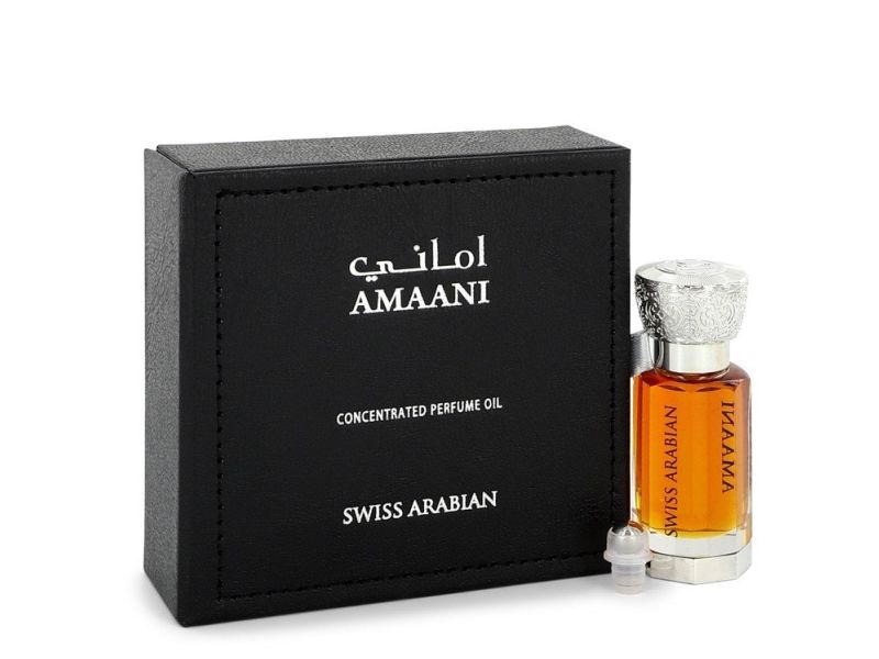 Released by Swiss Arabian Swiss Arabian Amaani is an earthy fragrance that is suitable for both men and women The opening of the cologne balances bright refreshing notes of raspberry and citrus with aromatic thyme lavender and saffron The heart of the fragrance is darker and warmer with notes of olibanum cypriol oil and leather