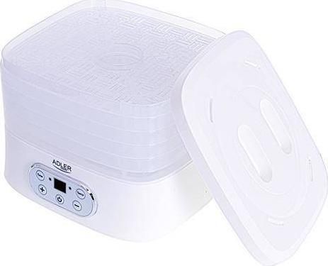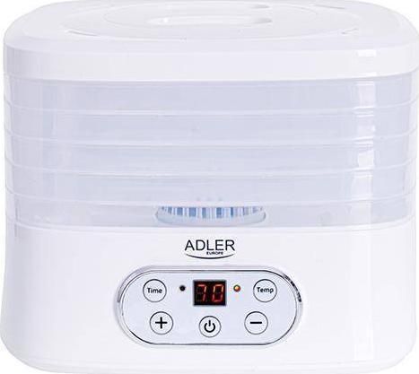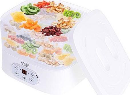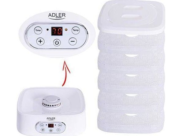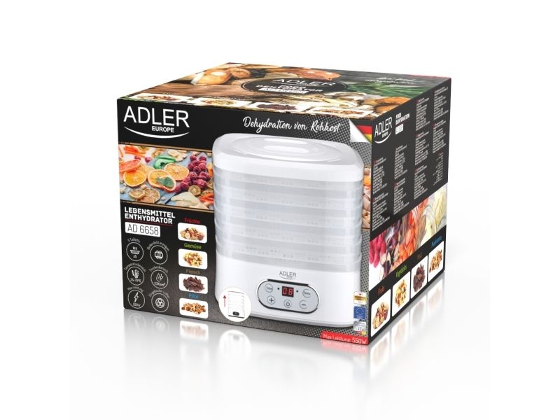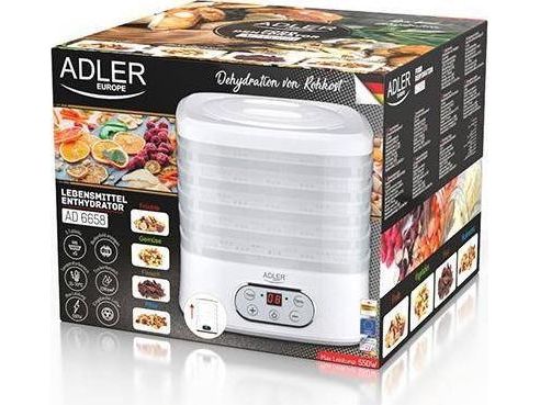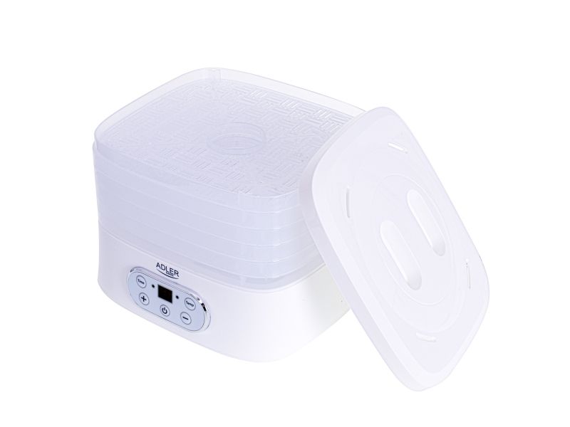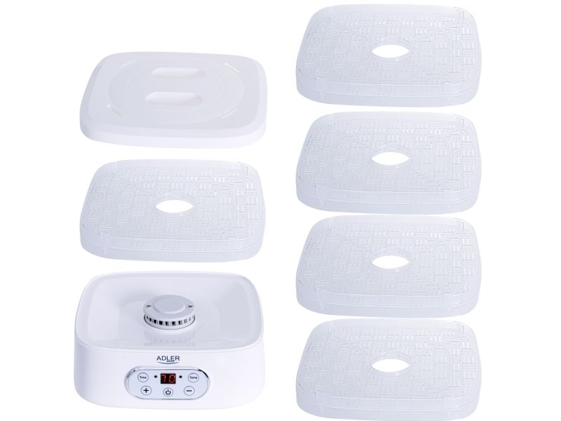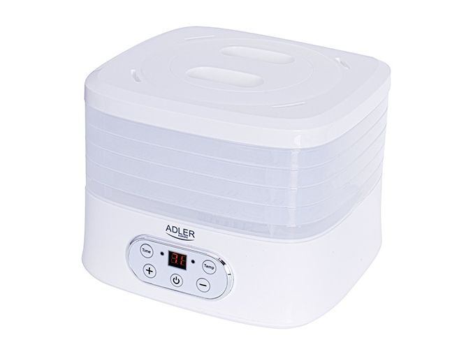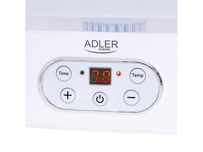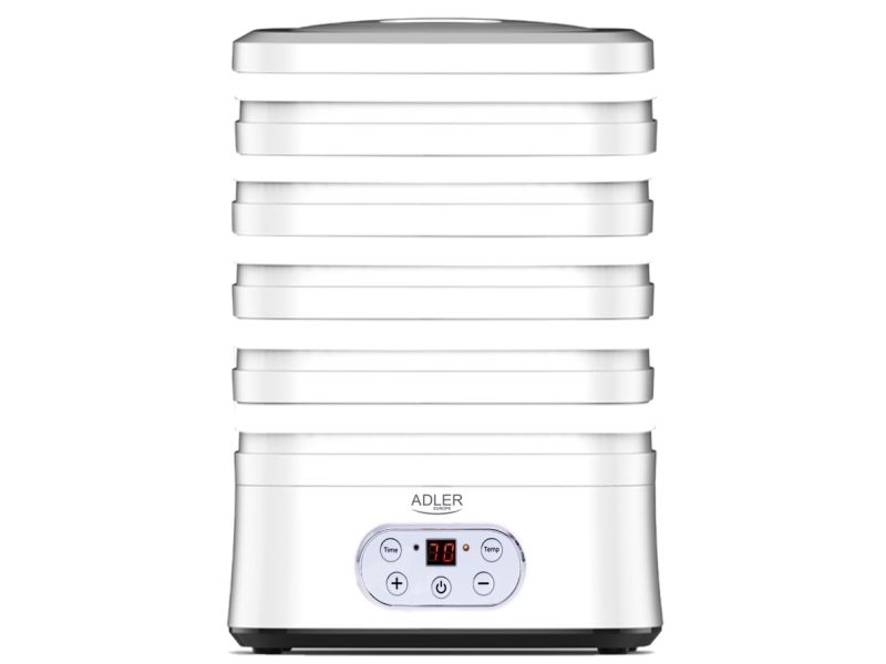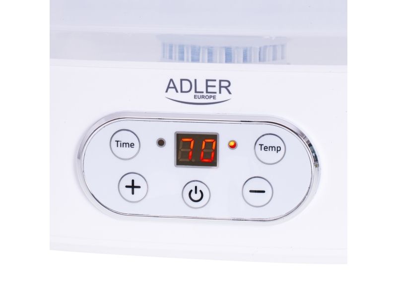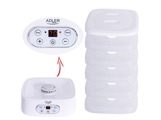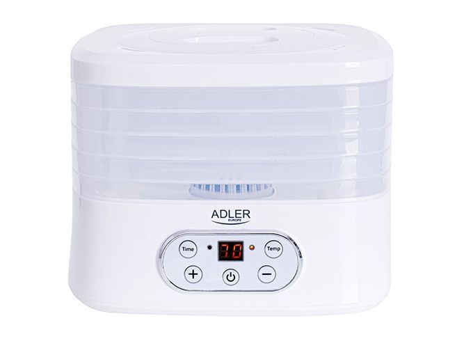 The dehydrator has a built-in timer. You can set the time of its operation from 1 to 70 hours. The temperature range is from 35 to 70°C, so you can dry any products here. It is equipment that allows you to produce healthy fruit and vegetable chips, our own Vegeta or dry meat, fish, or even pasta at home.Adler AD 6658. Product colour: White, Display type: LCD, Timer duration (maximum): 70 h. Power: 230 W. Width: 265 mm, Depth: 240 mm, Height: 210 mm. Package width: 315 mm, Package depth: 250 mm, Package height: 280 mm