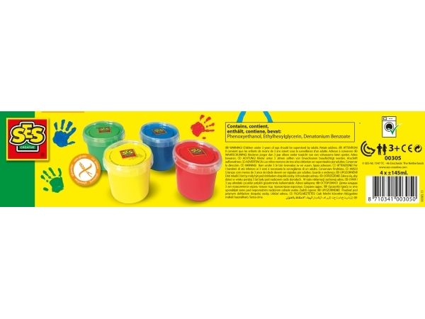 Get creative with SES creative and try a new activity! this high-quality set contains four pots of finger paints for your little artist to get started with and develop creativity! safe and non-toxic, the paints come in four modern and funky colours and are completely washable. A great way of developing hand-eye co-ordination and fine motor skills in children as well as being an excellent rainy day or party activity. SES has been the specialist in creative toys for more than 40 years. Child development is the central concept in the development of our products. As development is important during the early years, it is important that a child has the opportunity to develop his or her talents and to use their creativity. Besides developing creativity, safety and quality are the most important aspects of all our products! the products we develop are essential to the different developmental stages of any child.SES Creative SES Fingerpaint 4 Colours. Product colour: Multicolour, Number of paints included: 4 pc(s), Paint colour: Blue, Green, Red, Yellow. Width: 70 mm, Depth: 300 mm, Height: 70 mm. Packaging content: 4 x Paint Pots. Learning & training skills: Motor skills training. Quantity per pack: 4 pc(s), Package width: 224 mm, Package depth: 311 mm