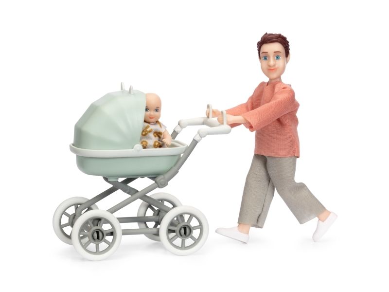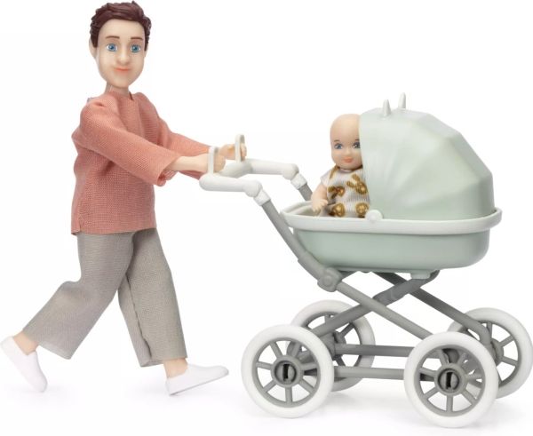 Dukkesett fra Lundby. To fine dukker, en voksen og en baby. Babyen har en god vognpose å ligge i, som passer til barnevognen som følger med. Barnevognen har små håndtak, roterende hjul og smarte håndtak til dukkens hender. Kalesjen kan justeres forover og bakover.