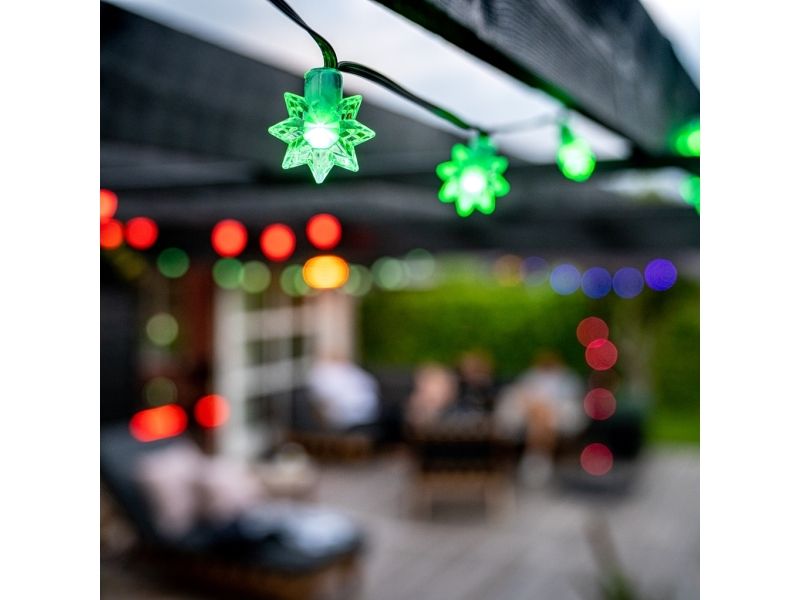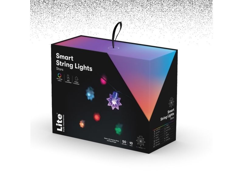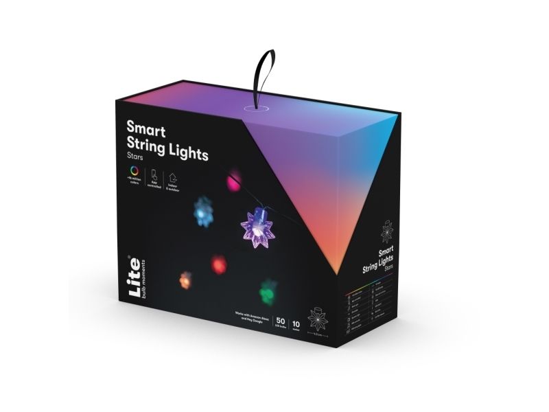 Experience a whole new level of lighting with the Smart Light Chain - Stars from Lite Bulb Moments. Perfect for all occasions from summer gatherings to Christmas festivities this versatile light chain injects life into your parties and transforms your space into a vibrant spectacle.  64 Million Color Combinations Fully Programmable via the TUYA App Music Synchronization with Built-in Microphone Compatible with Google and Alexa for Voice Control IP65 Waterproof Rating 64 Million Color Combinations Unleash your creativity with 64 million color combinations to choose from. Each light source in the Smart Light Chain has the potential to illuminate your space in a unique color setting the right mood for every event. Fully Programmable via TUYA App Take control of your lighting with the TUYA app where you can adjust brightness change colors set timers or even create personalized scenarios. If you prefer something quick and simple choose from 20 pre-programmed functions at the touch of a button. Music Synchronization with Built-in Microphone Turn your space into a dynamic light show using the light chain's music synchronization feature. Thanks to the built-in microphone your lights can flash or change colors to the beat of your favorite songs adding rhythm and energy to your parties. Compatible with Google and Alexa for Voice Control Integrate your Smart Light Chain seamlessly with Google and Alexa for hands-free voice control. Group multiple light chains together and manage them all with a single command providing you with effortless control over your lighting. IP65 Waterproof Rating Constructed with an IP65 waterproof rating the Smart Light Chain is resistant to rain and snow making it suitable for outdoor use. Hang it up in your backyard around your parasol or even in your apple tree for a magical outdoor ambiance. Package Contents: Smart Light Chain - Stars Power Supply Product Specifications: Model No: NSL911992 Voltage: 5V Max Power: 10W Colors: Multicolor (RGB purple pink etc.) - 64 million different colors Size: 10 meters (50 LED light sources with 20 cm distance) + 3-meter cable from plug to first LED Water Resistance: IP65 Lifespan: 30 000 hours