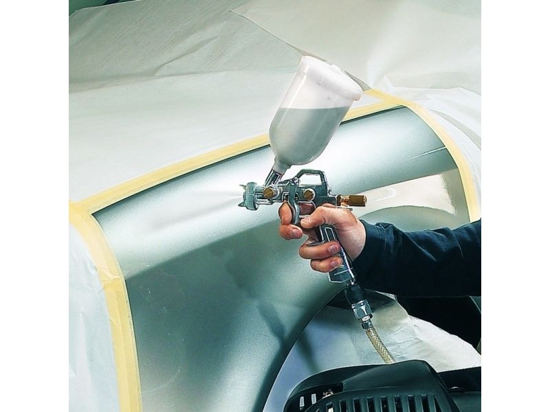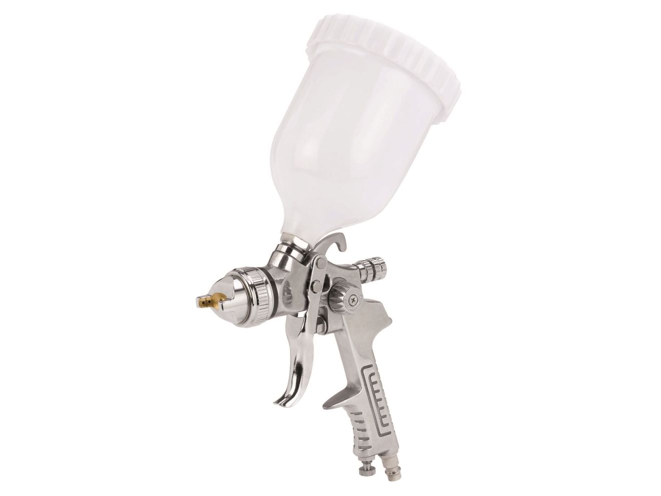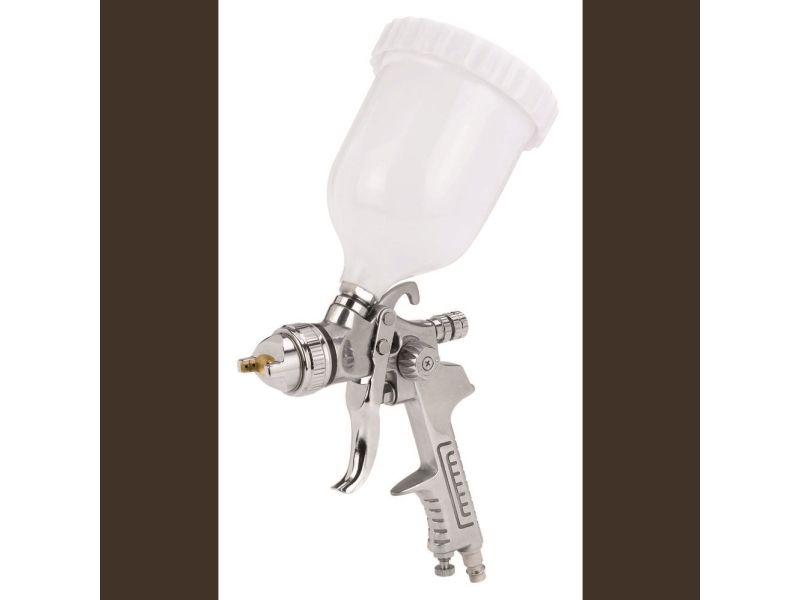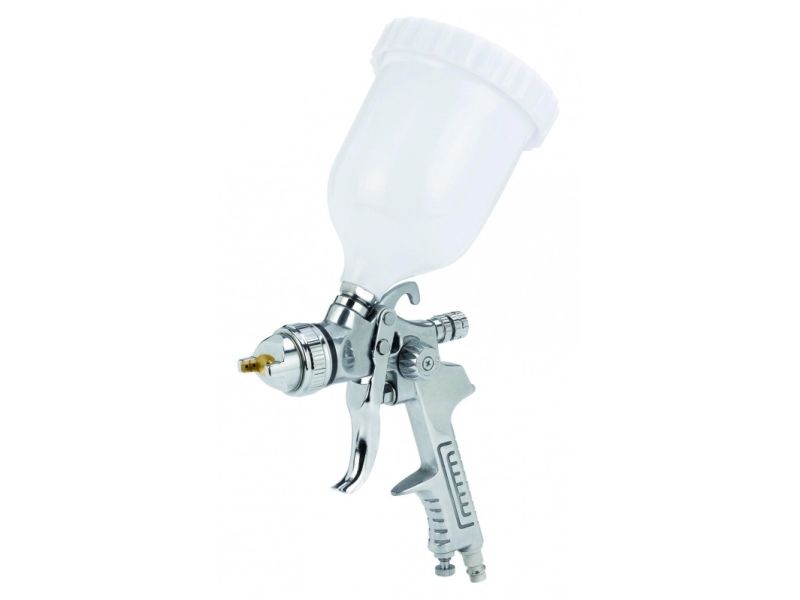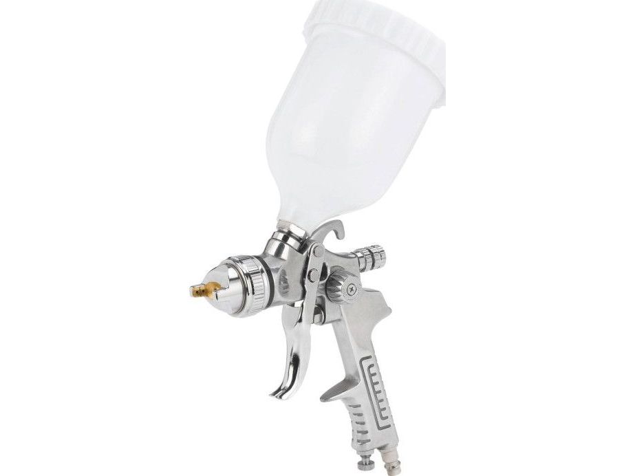 Den professionelle malerpistol med overkop er et robust og præcist værktøj med et driftstryk på 3-3,5 bar til udfordrende maleropgaver. Den er velkonstrueret og udført i høj kvalitet og giver flotte resultater. Den professionelle malerpistol har en regulator til at vælge mellem koncentreret eller bred stråle, så malerpistolen kan tilpasses den aktuelle opgave. For at gøre malerpistolen så alsidig som muligt er den forsynet med en drejelig dyse, som gør det muligt trinløst at indstille den brede stråle fra lodret til vandret. Mængderegulatorer sikrer, at malerpistolen leverer den ønskede mængde maling, og luftmængderegulatoren sparer mange gåture hen til kompressoren, da luftmængden kan indstilles direkte på malerpistolen. Overkoppen har en kapacitet på 0,6 liter, og en påfyldning rækker derfor langt under arbejdet. Der medfølger en nippel til lynkobling, så man også kan slutte malerpistolen til trykluft fra en kompressor.