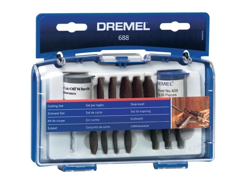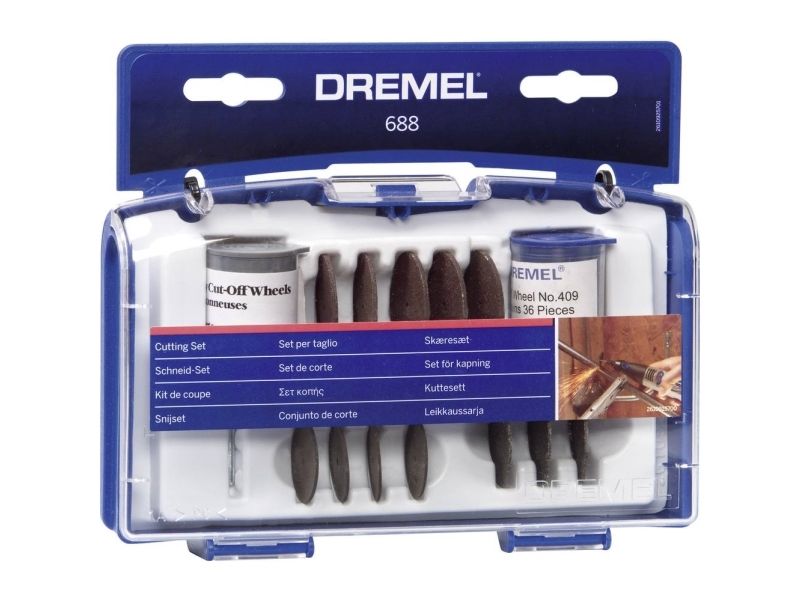 Assortment of 68 cut-off wheels in a convenient box. Removable accessory tray and 3 dividers provide perfect storage solution. Dremel Quick Start leaflet explains the included accessories.