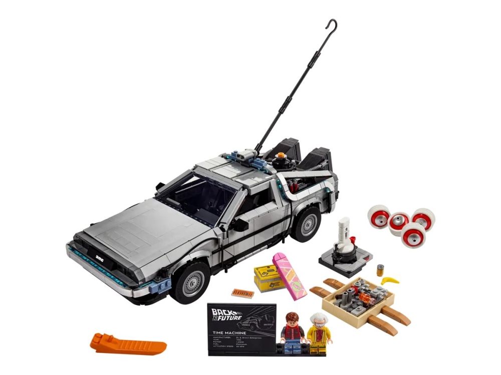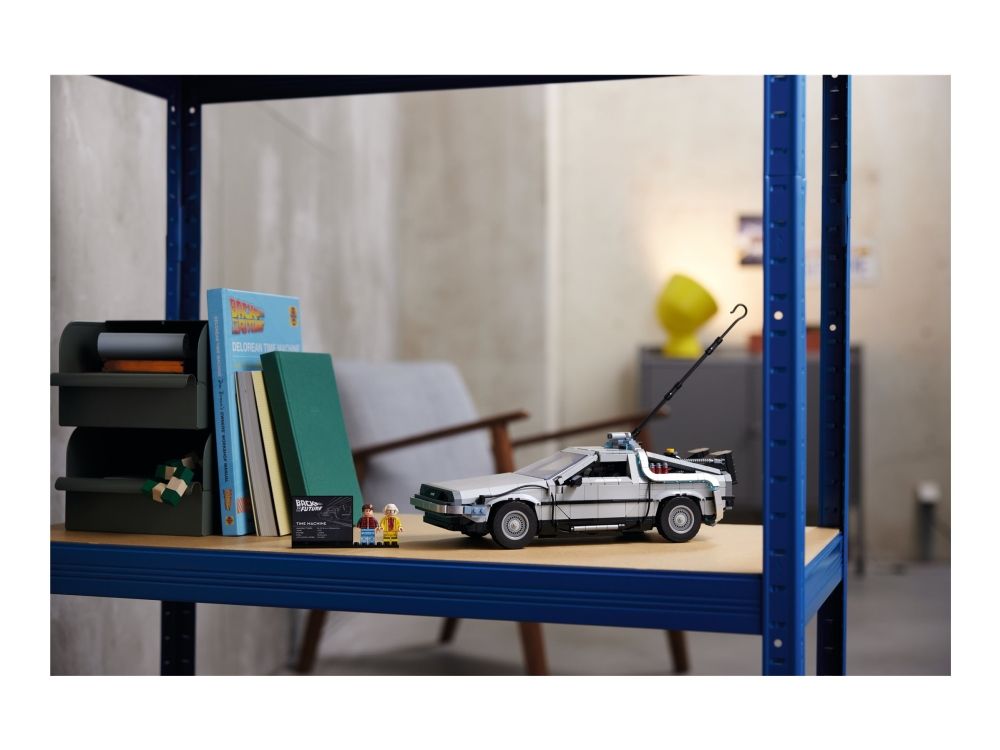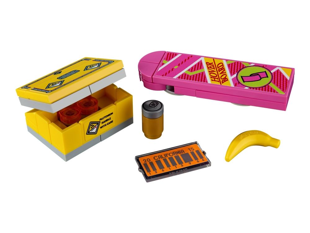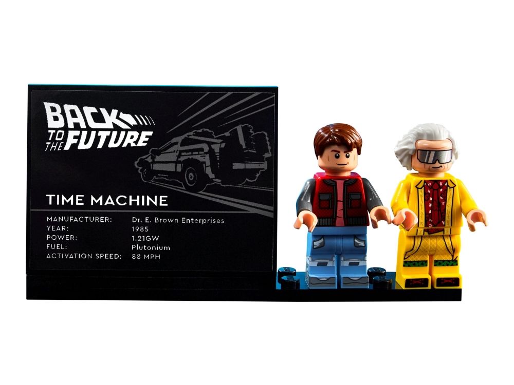 Inneholder to minifigurer samt tilbehør – se alle detaljene fra filmene, inkludert Martys svevebrett og OUTATIME-bilskiltene. Utstillingsmodellen inkluderer minifigurer av Doc og Marty McFly