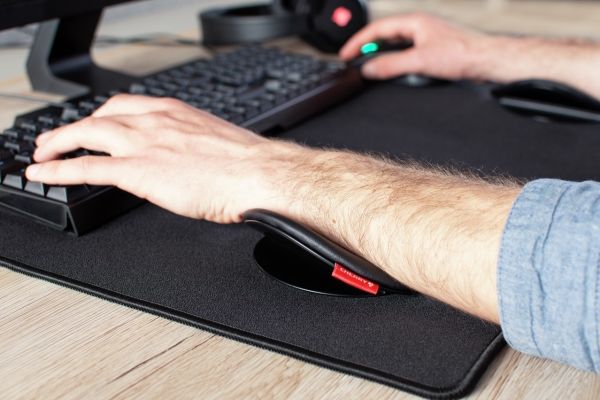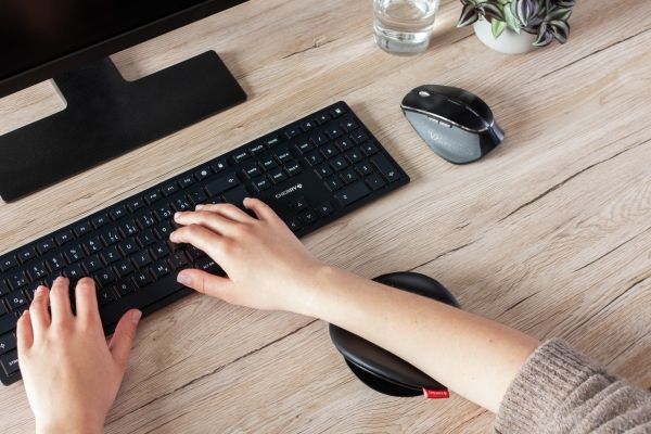 The CHERRY SLIDEPAD ERGO is a sliding armrest to improve ergonomics at the workplace. The articulating desk palm rest optimizes the position of your wrist and forearm, helping prevent pain when using the mouse and keyboard.