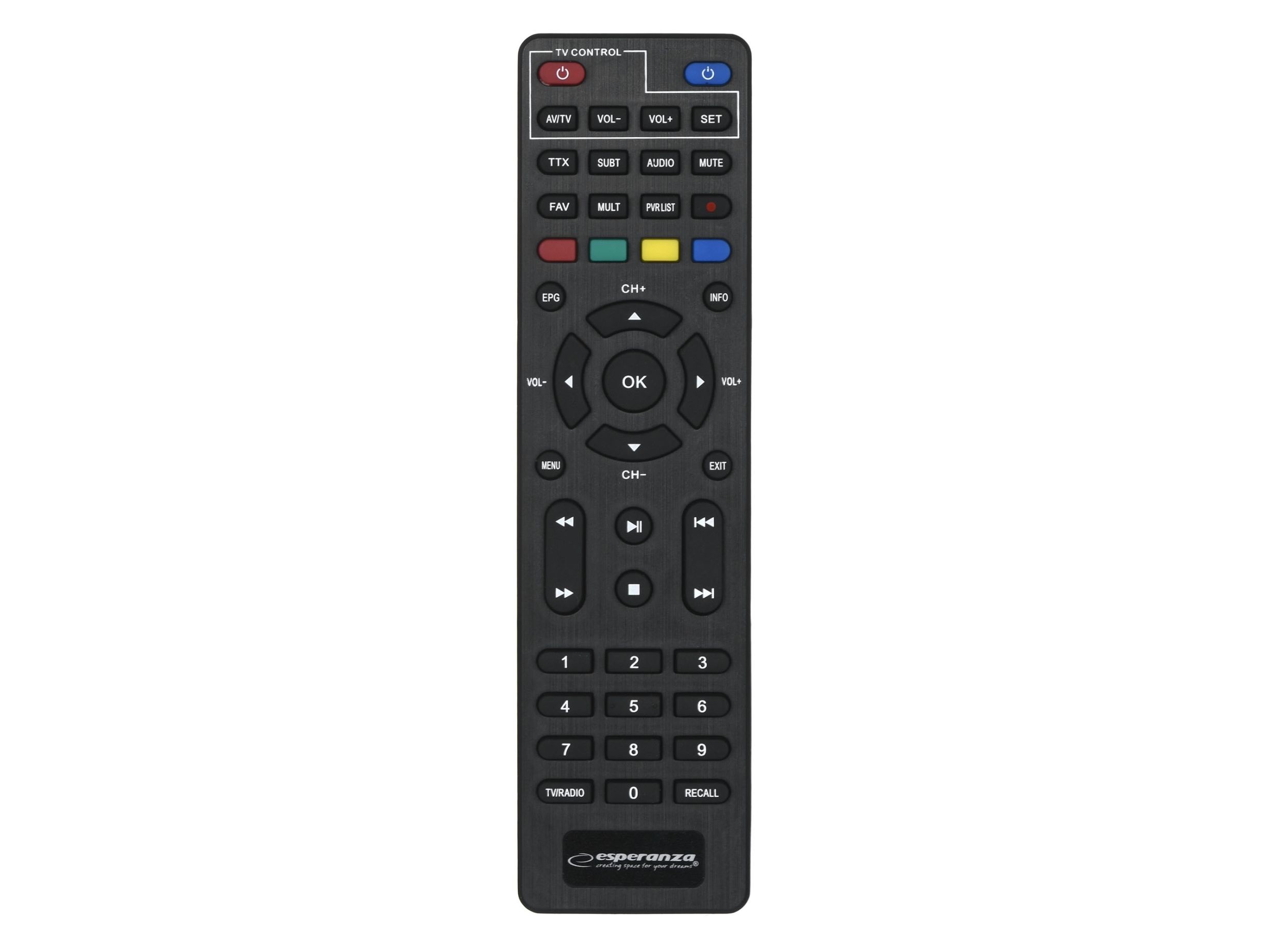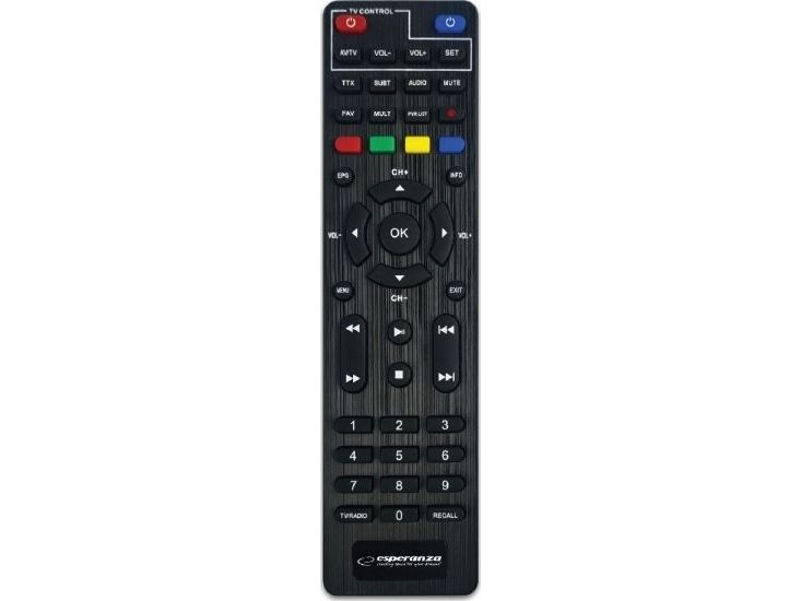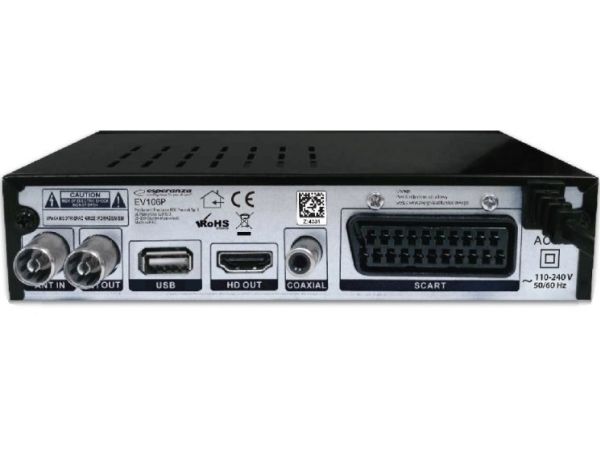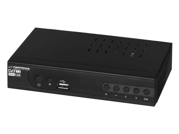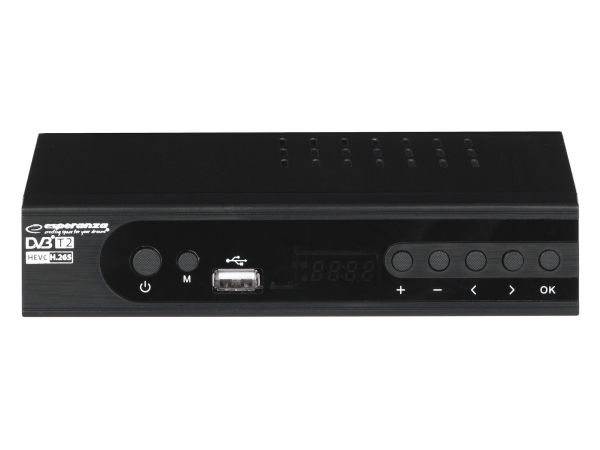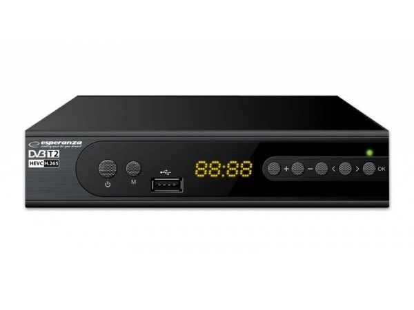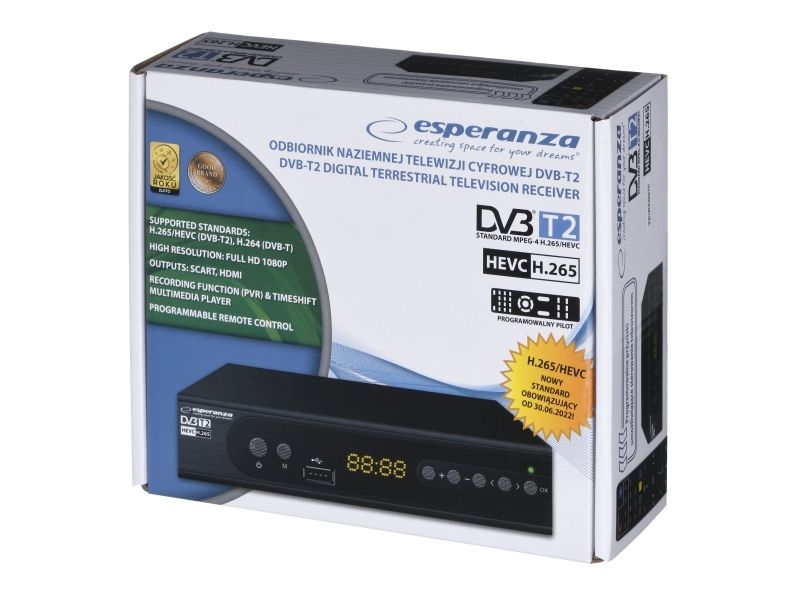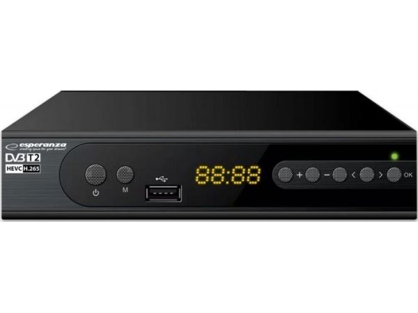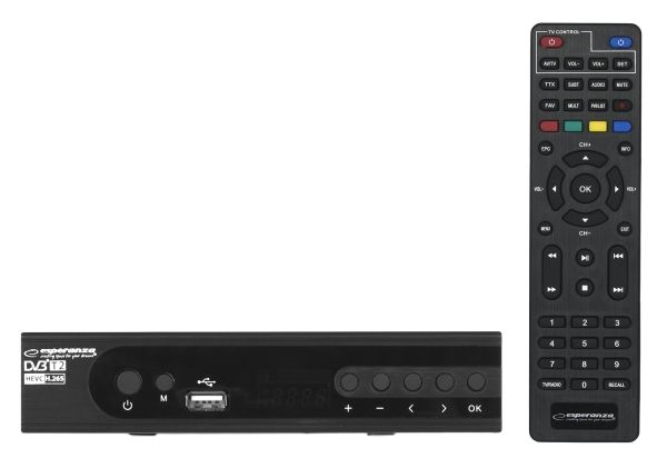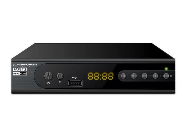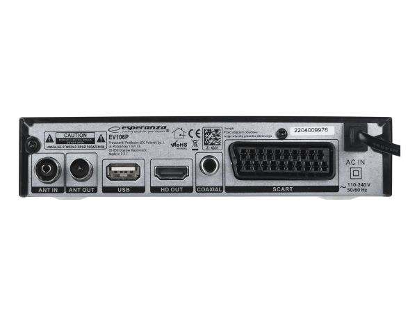The latest, modern version of the DVB-T/T2 digital terrestrial TV decoder with display. It enables the reception of free high definition digital terrestrial television signal in MPEG-2, MPEG-4 H.264/AVC and H.265/HEVC standards. Plays and sound compatible MPEG-1 (Layer 1,2,3) AAC, E-AC3. It has a built-in program recording function (Personal Video Recording) in digital quality with the possibility of delayed playback (Timeshift). All functions are easily accessible in the menu and directly from the functional remote control. The set-top box is equipped with a USB socket for connecting external storage media and recording or playing files and photos from them. It has a built-in SCART and HDMI socket, thanks to which it works with most TV sets available on the market. The set includes a programmable remote control (allows you to program the functions of the TV remote control and operate the set-top box and the TV with one remote control).Esperanza EV106P. Signal source: Cable, Digital signal format system: DVB-T2, Supported video modes: 576i, 576p, 720p, 1080i, 1080p. Video formats supported: HEVC/H.265, MPEG2, MPEG4. Product colour: Black, Tuner type: Analog & digital, Frequency range: 174 - 790 MHz. Power consumption (typical): 6 W, AC input voltage: 220- 240 V, AC input frequency: 50 Hz. Cables included: AC