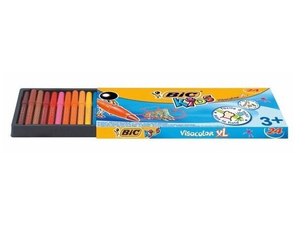 BIC Visacolor XL Ekstra tykke kvalitetstuscher som passer perfekt til børns hænder. Vandbaseret blæk, som let kan vaskes af tøj, hud osv. Holder i op til 2 måneder uden hætte. Ventileret sikkerhedshætte. Leveres i assorterede farver. Stregbredde 1,3 mm. Best.enhed: pakke a 24 farver. Kolli a 24 pakker.