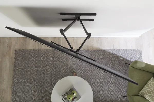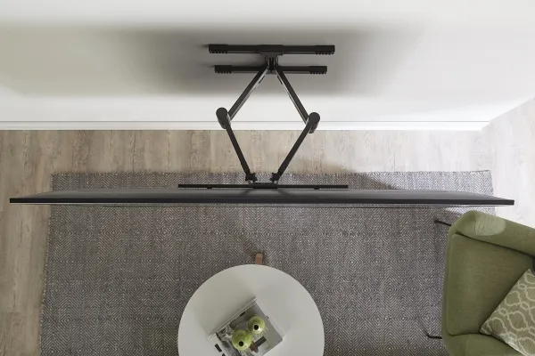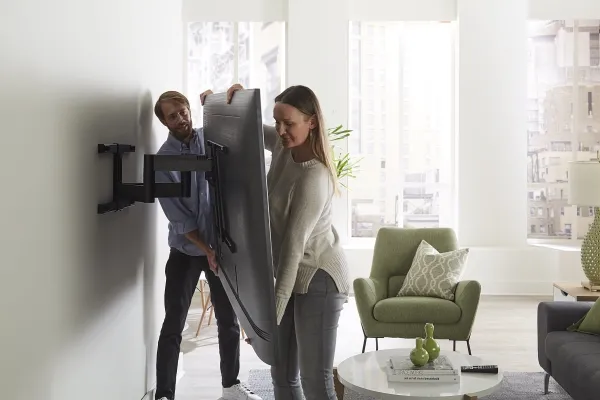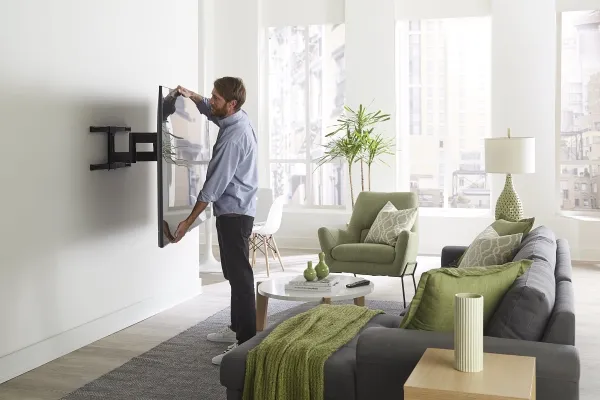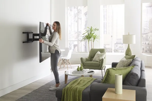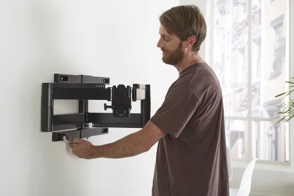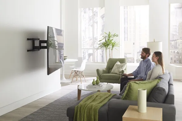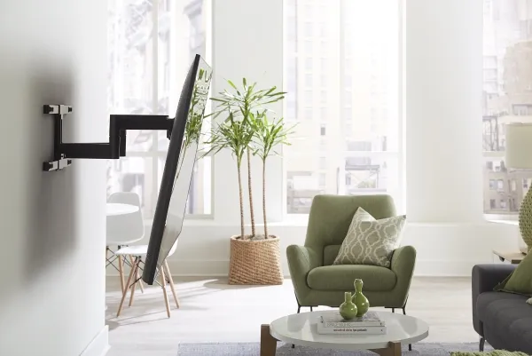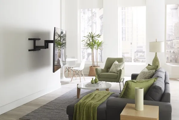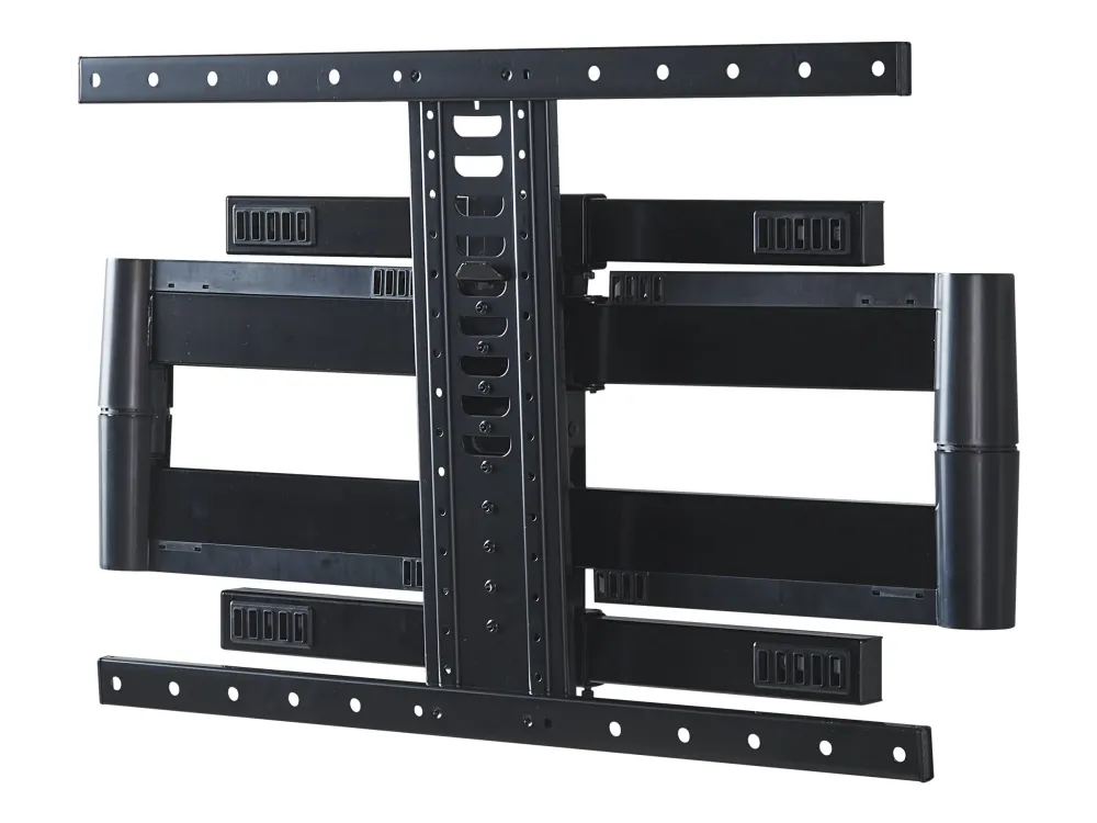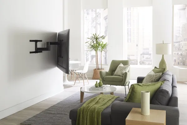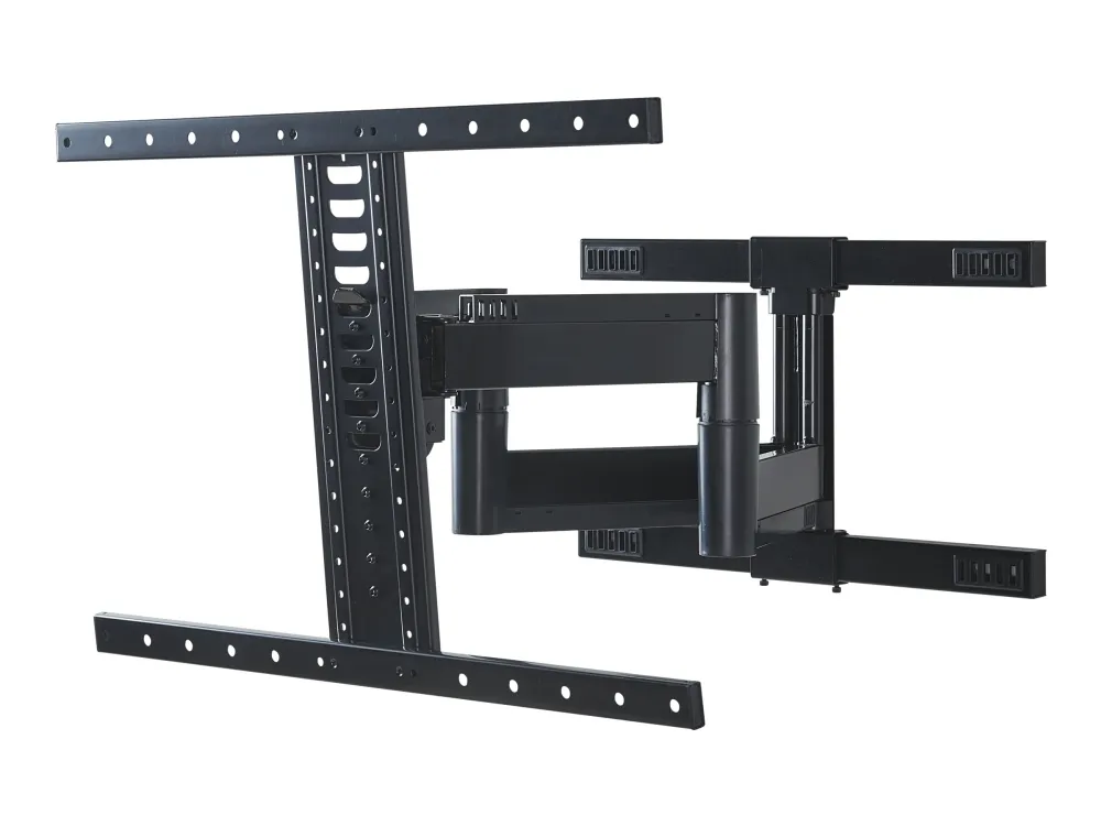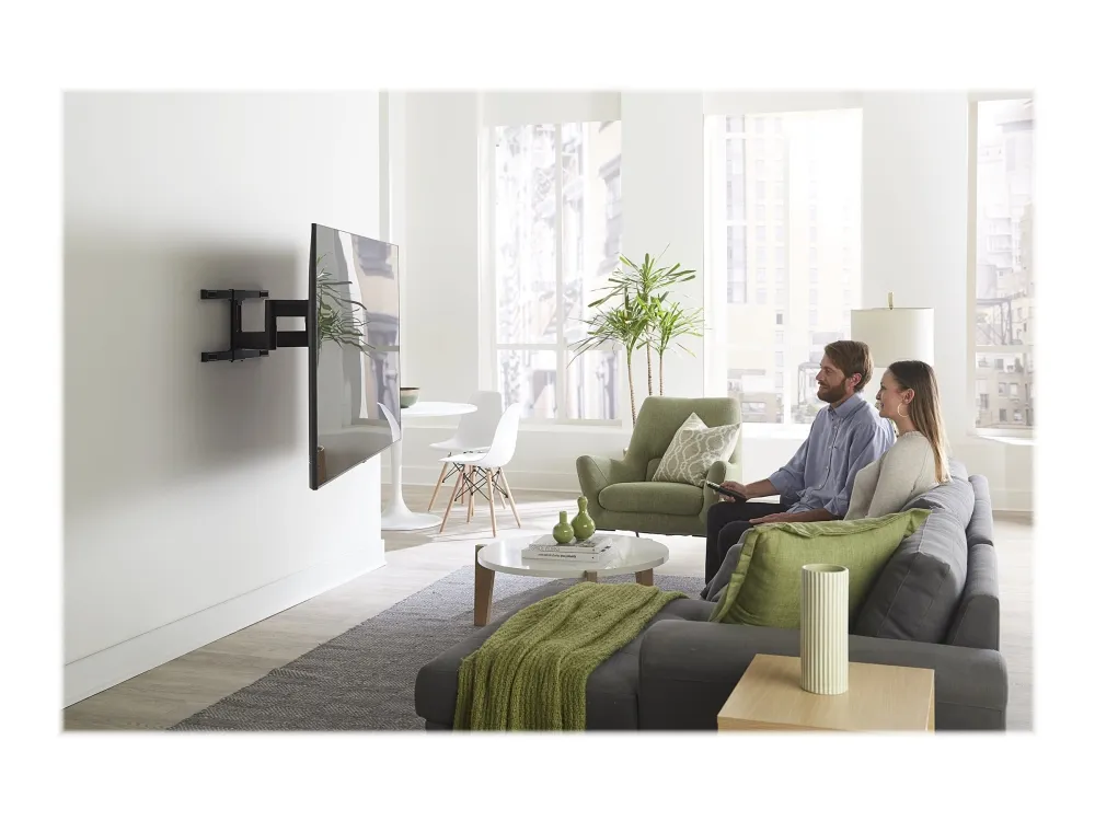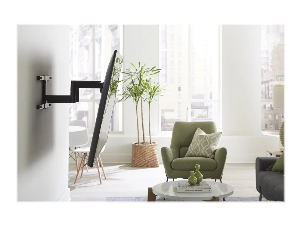 The Sanus Vuepoint FLF325 is a versatile full-motion wall mount solution for most 47" - 90" flat-panel TVs up to 120 lbs. Its full-motion movement allows smooth tilt, swivel and extension up to 25" from the wall without the use of tools, allowing for a great viewing angle anywhere in your room. During installation you can position your TV up or down 8" for optimal placement on the wall. An innovative in-arm channel conceals and routes cables the length of the mount for a clean appearance. Post-installation level adjustments ensure the TV is perfectly aligned with its surroundings. TV sits just 2.3" from the wall for a sleek low-profile look.